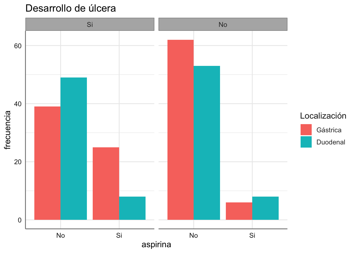 ggplot(Aspirina, aes(x = aspirina, y = frecuencia, fill = locali)) +
