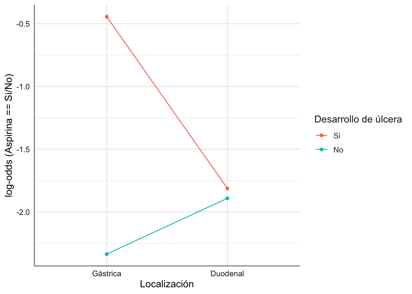 En un estudio retrospectivo de casos-controles, se reunió a un grupo de pacientes con úlcera y se buscó a otro grupo de individuos de similares características a los anteriores en edad, sexo y estatus socio económico, sobre los que no se sabía que tuvieran úlcera péptica. Los pacientes con úlcera fueron clasificados de acuerdo a la localización de la úlcera: gástrica o duodenal. Se les preguntó a todos si consumían aspirina. El objetivo del análisis es averiguar si existe alguna relación entre el consumo de aspirina y la existencia de algún tipo de úlcera. Si existe tal asociación, querríamos comprobar si el consumo de aspirina (aspirina) es más habitual en los pacientes con úlcera gástrica que en los de úlcera duodenal (locali). Interesa predecir el consumo de aspirina (variable a explicar) en función de si un individuo tiene úlcera o no (ulcera). y si la tiene, de qué tipo es. La variable frecuencia contiene los conteos de las combinaciones de tratamientos.
