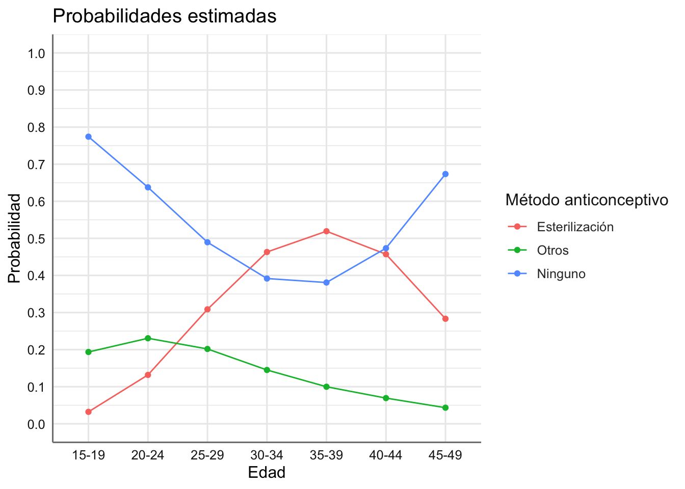 En la tabla aparecen los datos de un estudio sobre distintos usos contraceptivos en diferentes grupos generacionales. Entendiendo la variable método contraceptivo (metodo) como variable respuesta y la variable edad (edad) como predictiva, una cuestión de interés puede ser predecir el uso anticonceptivo de una mujer en función de su edad. La variable frecuencia contiene los conteos para todas las combinaciones.