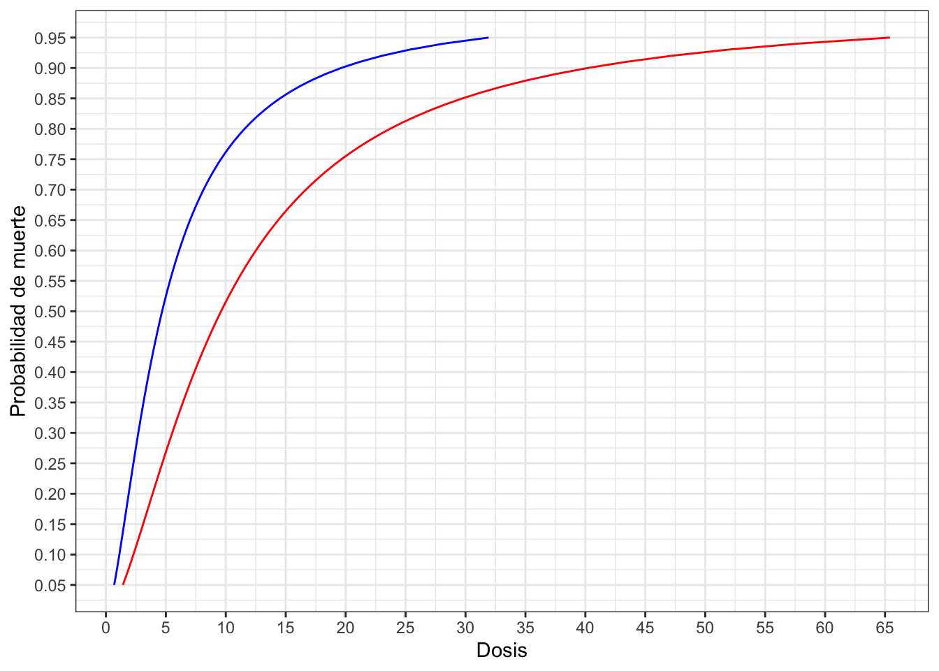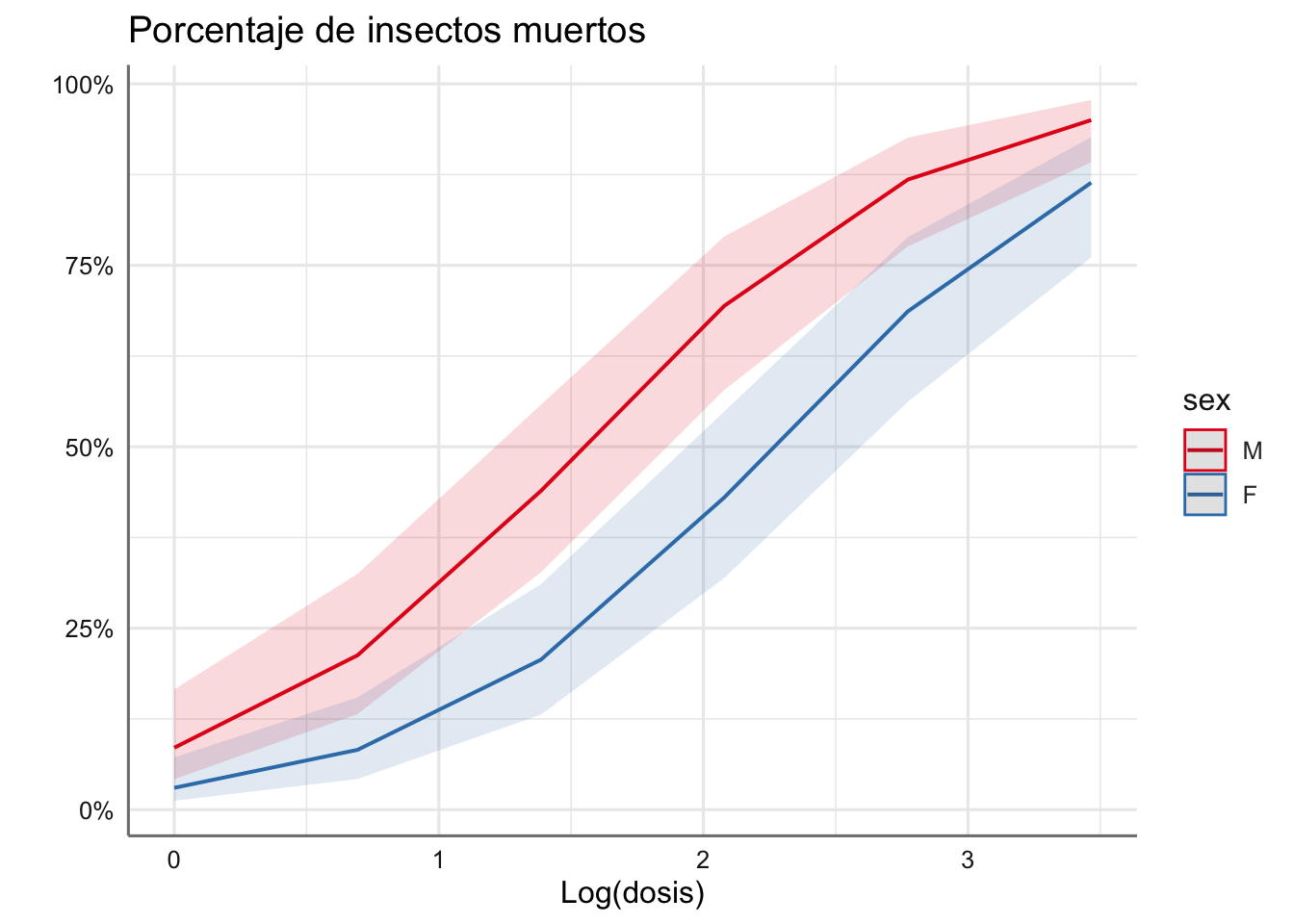 En los perfiles obtenidos se aprecia claramente el paralelismo entre ambos sexos, mostrando que las hembras son más resistentes (probabilidad de morir más baja) para todos los niveles de dosis considerados, y que la probabilidad de morir aumenta con la dosis suministrada.