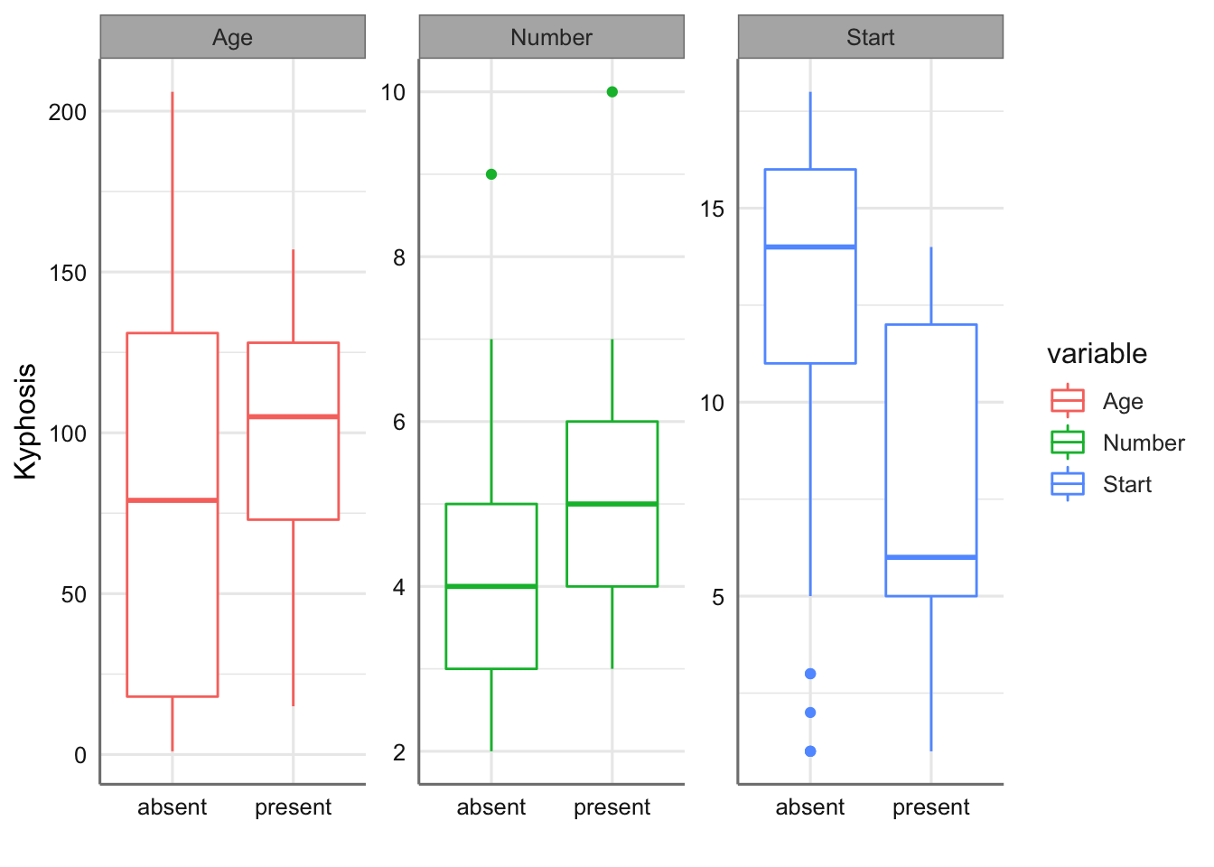 datacomp = melt(kyphosis, id.vars='Kyphosis')