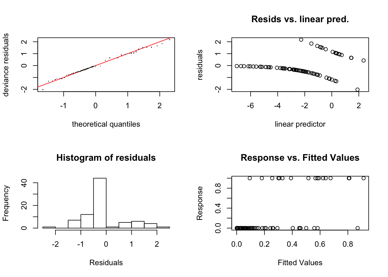 Este problema no aparece cuando tenemos datos agrupados ya que la variable respuesta ya es un valor entre 0 y 1, ya que modelizamos directamente la probabilidad de éxito.