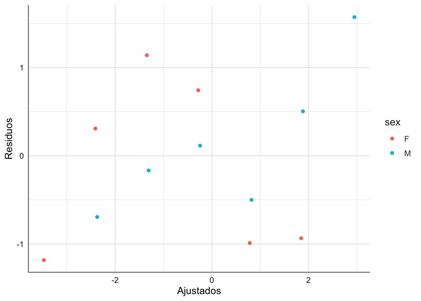 ggplot(diagnostico, aes(x = .fitted, y = .stdresid, color = sex)) +