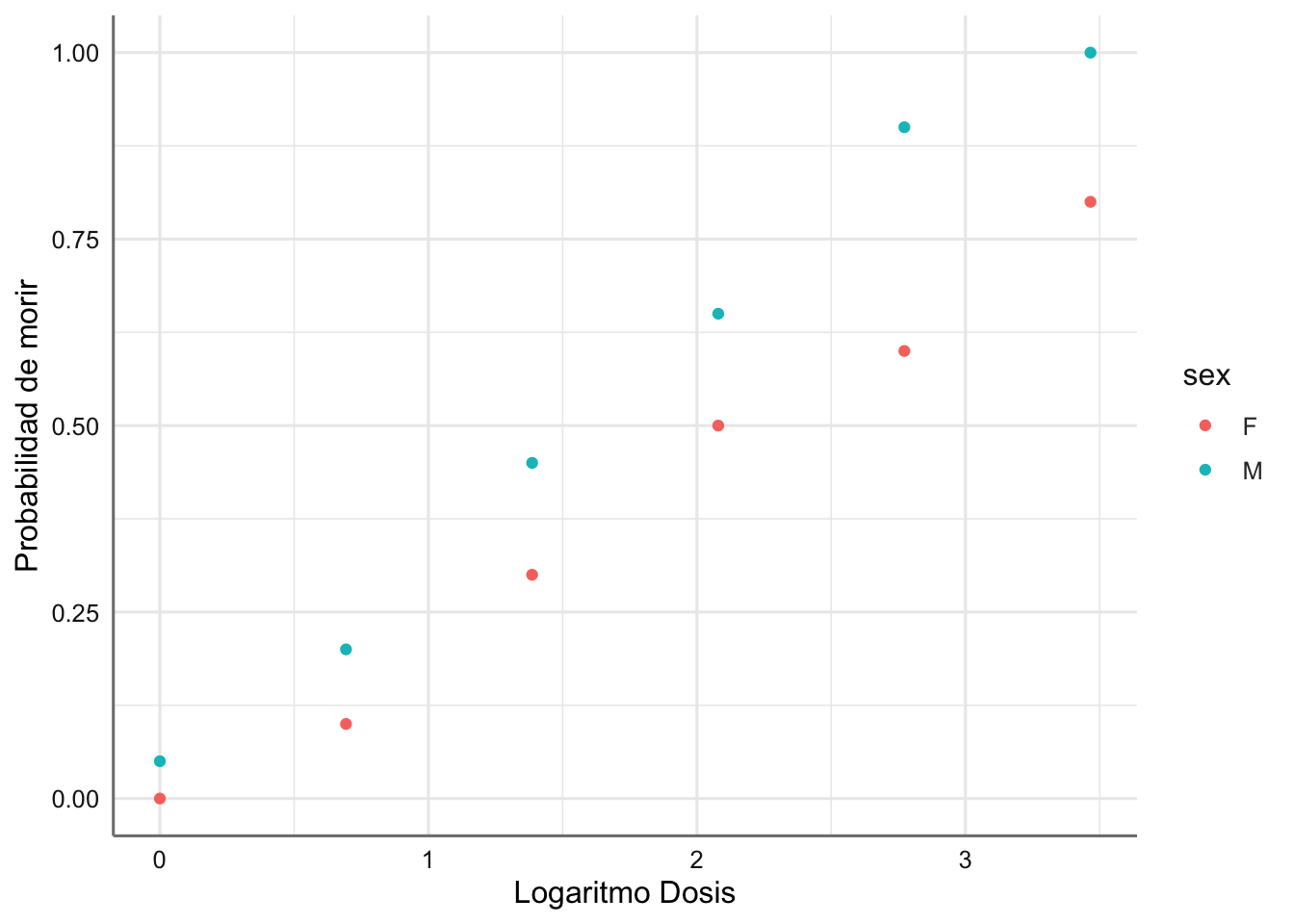 Se observa que para la misma dosis la probabilidad de morir en las hembras es menor que en los machos. Además, hay una tendencia creciente con la dosis, es decir, cuanto aumenta la dosis aumenta la probabilidad de morir.