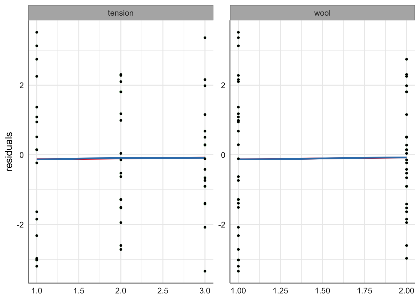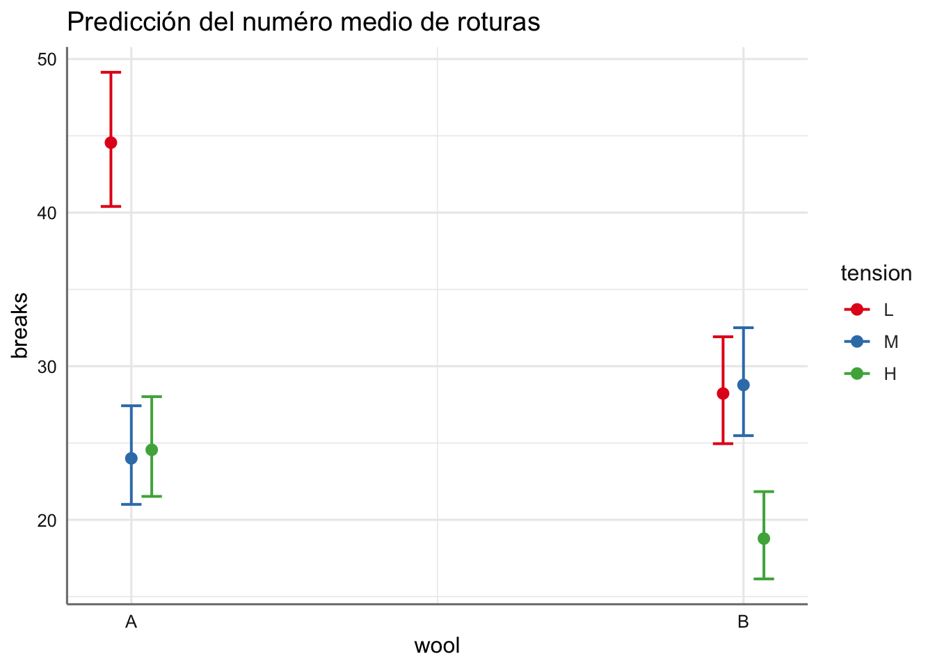 Se puede ver un efecto conjunto entre tension y wool. Parece bastante claro que deberemos considerar un efecto de interacción para este modelo. De hecho, se aprecian curvas descendientes con tension (indicando que las telas sufren menos roturas a mayor tensión) no apreciándose efecto lineal lo que puede provocar que no se verifiquen las hipótesis del modelo, y que sea necesario introducir ciertas tendencias en las variables predictoras. En el tipo de lana resulta imposible hacer esto porque es una variable categórica nominal, pero si podríamos hacerlo con tension si consideramos la variable numérica construida a partir de ella.