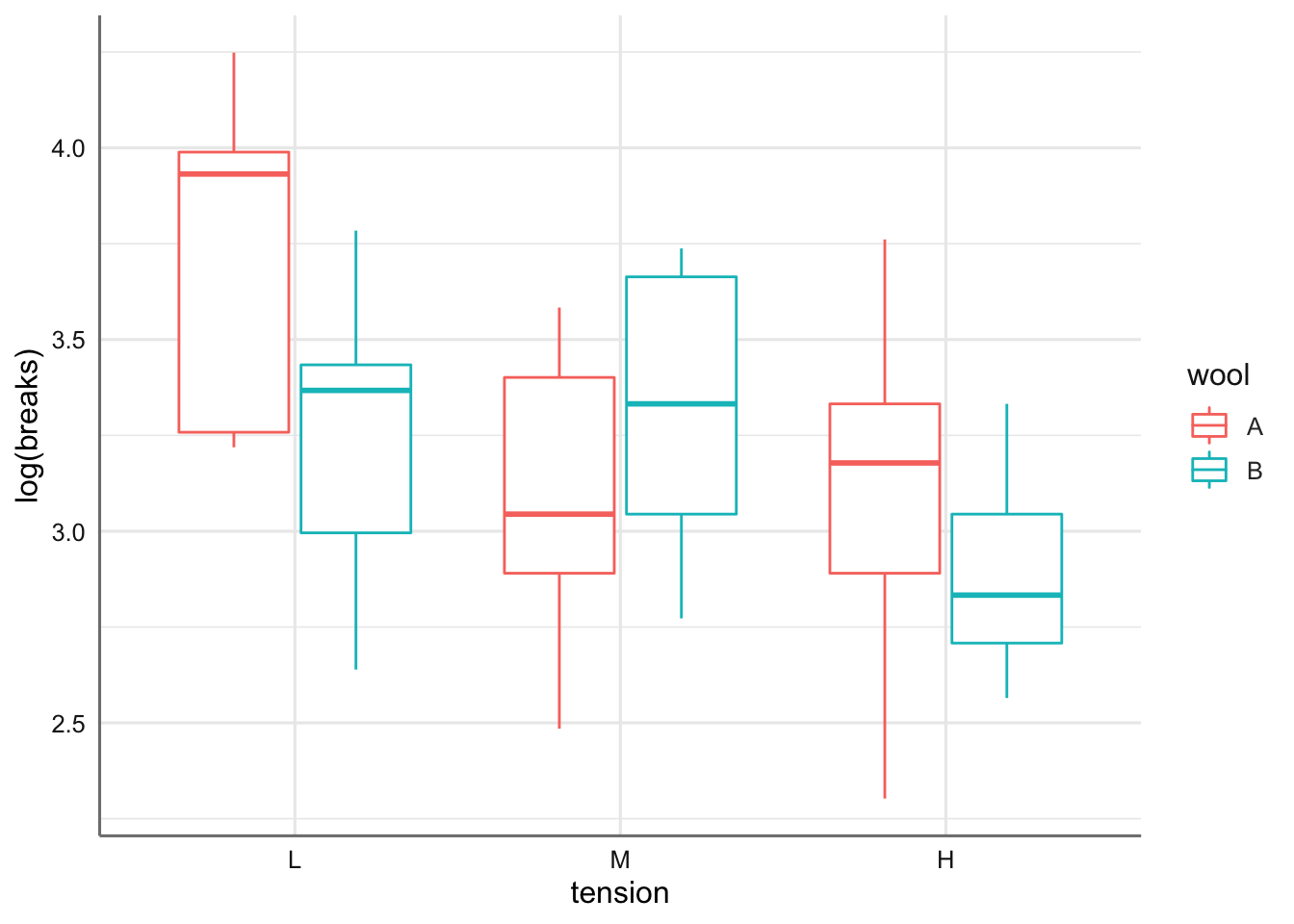 log(breaks)_{woolB;tensionH} & = 3.80 - 0.46 - 0.60 + 0.19 = 2.93 \\