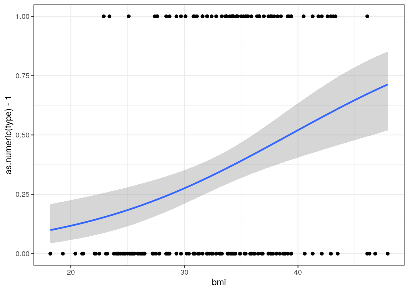 ## glm(formula = type ~ bmi, family = binomial(link = logit), data = Pima.tr)
