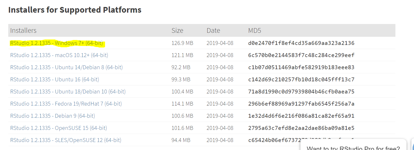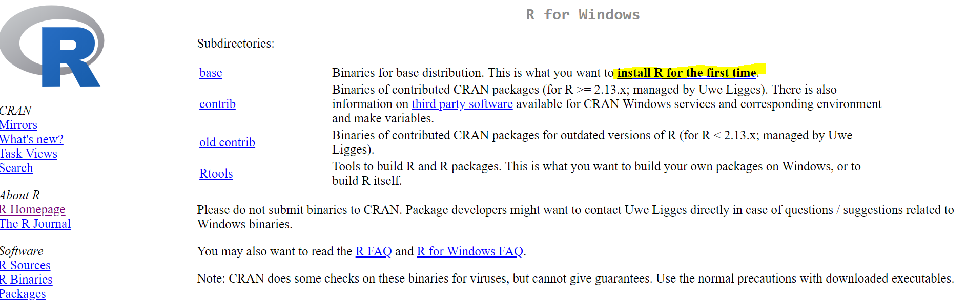 Click on the link for your computer’s operating system (PC, Mac, or Linux), and you will be taken to a page with a few download options (titled “Subdirectories”). For the purposes of this package, click the link next to the “base” version that says “install R for the first time.”