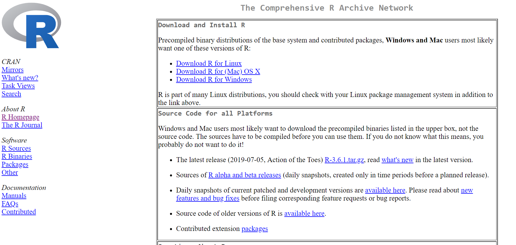 R is an open-source programming language originally developed for statistical analysis. It has gained popularity and functionality throughout the decades and is now a common workhorse for environmental data scientists. Download R from the Comprehensive R Archive Network (CRAN) repository. Note that this website has an astounding amount of resources for curious R users (instructions, FAQ’s, manuals, and more).
