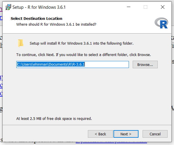 The next page provides the download link, which downloads the executable file to your computer. Double clicking the install file opens an installer window. Be sure to note the folder in which you installed the R program.