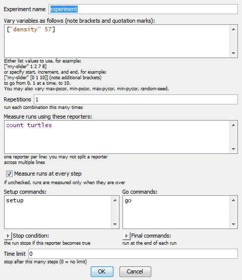 en este orden. Repetitions: Indica el número de repeticiones que se hará para ca- da punto del espacio de parámetros. Esta repetición puede ser im- portante si la evolución del modelo varía incluso para los mismos valores de los parámetros 7 . Measure runs: Indica qué valores mediremos en cada ejecución. Aquí se puede escribir cualquier reporte, por ejemplo: count turtles , y se pueden poner tantas medidas como se desee, una en cada lí- nea 8 . Measure runs at every step: Indica si las grabaciones de datos de- ben hacerse en cada paso del modelo o no 9 . Setup commands: Son los comandos que se usarán para iniciar el modelo en cada ejecución. Go commands: Los comandos que se usarán para ejecutar cada pa- so del modelo.