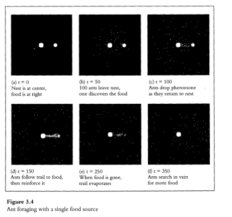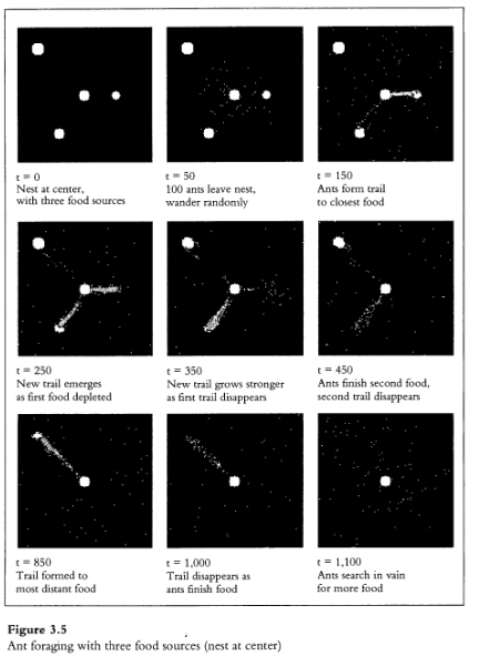 1404/5000 Cuando se ejecuta el programa, cientos de hormigas salen del nido, búsqueda (al azar) de alimentos (figura 3.4a-b). Una vez que una hormiga encuentra algo comida, trae una pieza de regreso al nido, colocando un rastro de feromona verde como vuelve (figura 3.4c). Al principio, el sendero verde es delgado y tenue. Pero como otras hormigas siguen la feromona hasta la comida y refuerzan el rastro en de regreso al nido, se desarrolla un sendero verde brillante y espeso (figura 3.4d). El rastro de feromonas es un ejemplo de una estructura ordenada a gran escala. estructura, creada completamente a través de interacciones locales. Dura solo mientras La fuente de alimento. Una vez que la fuente de alimento está completamente explotada, el sendero verde gradualmente se desvanece (figura 3.4e), y las hormigas deambulan sin rumbo fijo (figura 3.4f). Este programa se puede extender de varias maneras. Por ejemplo, podríamos agregue dos nuevas fuentes de alimentos, cada una a una distancia diferente del nido. (Las nuevas fuentes de alimentos se pueden agregar con unos simples cambios en el procedimiento de configuración de alimentos.) El comportamiento resultante a nivel de colonia es bastante llamativo (figura 3.5). La colonia explota las fuentes de alimento como si estuviera controlada. por un plan centralizado. Las hormigas inicialmente explotan la fuente más cercana a la nido, luego (después de que la fuente se haya agotado por completo) comienzan a explotar siguiente fuente más cercana, y así sucesivamente. Es como si algún líder en el nido tuviera desarrolló un plan para recolectar los alimentos de manera sistemática y secuencial
