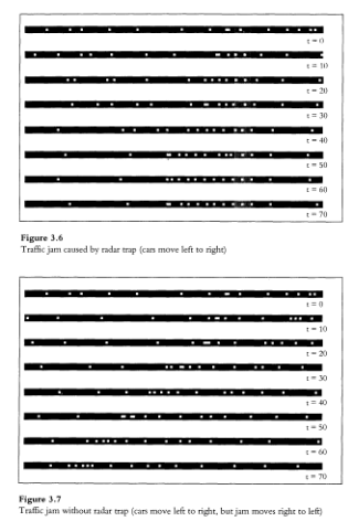 2766/5000 Ari y Fadhil notaron que un accidente al costado del camino tienen el mismo efecto que la trampa del radar, debido al infame “cuello de goma” efecto “cuello de goma”. En tacto, argumentaron que incluso una pequeña interrupción podría causar un mermelada. Fadhil explicó: “Cuando un automóvil en la carretera incluso toca el frenos, las luces de freno se encienden. Incluso si no se ralentiza, todos De lo contrario, se ralentiza. Si la primera persona solo toca el freno, el freno las luces se encienden y la persona detrás de él no quiere golpearlo, así que se ralentiza un poco más, y la persona detrás de él un poco más, y la persona detrás de él más, y terminas teniendo un atasco de tráfico. Y el primer tipo ni siquiera bajó la velocidad”. Le pregunté a Ari y Fadhil qué pasaría si solo algunos de los autos tuvieran detectores de radar. Ari predijo que solo algunos de los autos frenarían abajo para la trampa del radar. Fadhil tenía una idea diferente: “Las que tienen los detectores de radar se ralentizarán, lo que hará que los otros disminuyan abajo”. Ari encontró ese argumento convincente y rápidamente cambió su ’ mente. Y, de hecho, Fadhil tenía razón. Modificamos el programa StarLogo programa para que solo el 25 por ciento de los automóviles tengan detectores de radar (es decir, solo El 25 por ciento de los autos tenía activado el radar-demonio). El resultado: el el flujo de tráfico se veía exactamente igual que cuando todos los autos tenían radar detectores ¿Qué pasaría si ninguno de los autos tuviera detectores de radar o, equivalentemente, si el trampa de radar fueron eliminados por completo? Sin trampa de radar, los autos estarían controlado por solo dos reglas simples: si ve otro automóvil muy cerca, Ve más despacio; si no, acelera. Las reglas no podrían ser mucho más simples. A primero, Fadhil predijo que el flujo de tráfico sería uniforme: los automóviles estaría espaciado uniformemente, viajando a una velocidad constante. Después de todo, sin la trampa del radar, ¿qué podría causar un atasco? Pero rápidamente cambió de opinión. y predijo que se formaría un atasco de tráfico. De hecho, cuando ejecutamos el programa, se formó un atasco de tráfico (figura 3.7). A lo largo de partes del camino, los autos estaban apretados y se movían lentamente. En otros lugares, estaban dispersos y moviéndose al límite de velocidad. Al ver una de las mermeladas apretadas, Fadhil recordó el juguete. con cinco bolas de péndulo seguidas. Cuando una bola de péndulo golpea uno Al final del paquete, una bola se dispara desde el otro extremo. El embotellamiento se veía algo similar: “Cada vez que un auto sale [del atasco], otro entra uno, entonces [el atasco] mantiene la misma cantidad. . . . Luego otro quedará atrapado y otro se irá. Atrapado, irse, atrapado, irse”. Fadhil pensó que los atascos fueron causados por diferencias en la inicial velocidades de los autos. Entonces cambiamos el programa StarLogo, comenzando todo Los autos a la misma velocidad. Pero las mermeladas todavía se formaron. Fadhil rápidamente entendió,