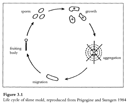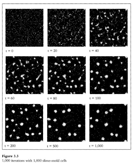 3998/5000 El moho limo no es la criatura más glamorosa. Pero seguramente Uno de los más extraños e intrigantes. Mientras la comida sea abundante, Las células de moho limo existen independientemente como pequeñas amebas. Ellos mueven alrededor, alimentarse de bacterias en el medio ambiente y reproducirse simplemente dividiendo en dos. Pero cuando la comida escasea, el moho del limo El comportamiento cambia dramáticamente. Las células del moho limo dejan de reproducirse y se mueven una hacia la otra, formando un grupo (llamado “pseudoplas- modium”) con decenas de miles de células. En este punto, las células del moho limo comienzan a actuar como un todo unificado. En lugar de comportarse como muchas criaturas unicelulares, actúan como una sola criatura multicelular En resumen, “ellos” comienzan a actuar como “eso”. Cambia forma y comienza a gatear, buscando un ambiente más favorable. Cuando encuentra un lugar a su gusto, se diferencia en un tallo que sostiene una ronda Masa de esporas. Estas esporas finalmente se desprenden y se extienden por todo el nuevo entorno, comenzando un nuevo ciclo como una colección de moho limo amebas El proceso a través del cual las células de moho limo se agregan en un solo La criatura multicelular ha sido objeto de debate científico. Hasta 1980 más o menos, la mayoría de los biólogos creían que las células especializadas “marcapasos” coordinaban coordinó la agregación. Pero los científicos ahora ven la agregación de moho limo como Un proceso muy descentralizado. Según las teorías actuales, el limo las células del moho son homogéneas: ninguna se distingue por ninguna característica especial características o comportamientos. La agrupación de células de moho limo no surge de la comandos de un líder pero a través de interacciones locales entre miles de células idénticas De hecho, el proceso de agregación de moho limo es ahora visto como uno de los ejemplos clásicos de comportamiento autoorganizado. ¿Cómo se agregan las células del moho limo? El mecanismo implica un químico llamado “AMP cíclico” o AMPc (Goldbeter y Segal 1977). Cuando las células del moho limo pasan a su fase de agregación, producen y emiten AMPc en el medio ambiente. También se sienten atraídos por El mismo químico. A medida que las células se mueven, siguen el gradiente de acampar. Es decir, prueban a su alrededor y se mueven en la dirección dirección donde la concentración de cAMP es más alta. Tenga en cuenta que este proceso Es muy local. Cada célula puede detectar cAMP solo en su vecindad inmediata; eso no se puede saber cuánto cAMP puede haber a unos centímetros de distancia. Escribí un programa StarLogo para explorar el funcionamiento de este descentralizado. proceso de agregación descentralizada. No me interesaba simular cada detalle del mecanismo real del molde de limo. En el mecanismo real, limo Las células del moho producen el cAMP en pulsos periódicos. Como resultado, el moho limo Las células tienden a unirse en ondas concéntricas. Pero esta periodicidad no parece esencial para el proceso de agregación. De hecho, Prigogine y Stengers A984) describe cómo las larvas de ciertos escarabajos (Dendroctonus ** micans) se agregan en grupos utilizando un mecanismo similar al utilizado por j§ células de moho limo, pero sin la periodicidad. *. Mi objetivo era capturar la esencia del proceso de agregación con 1 el mecanismo más simple posible. Mi programa StarLogo se basó en un Conjunto de reglas simples. Cada tortuga estaba controlada por cuatro demonios: uno el demonio hizo que la tortuga se moviera, un segundo agregó un poco de aleatoriedad al los movimientos de la tortuga, un tercio hizo que la tortuga emitiera una feromona química, y un cuarto hizo que la tortuga “olfatee” la feromona y voltee dirección donde el producto químico era más fuerte (es decir, seguir el gradiente de la feromona). Mientras tanto, cada parche estaba controlado por dos demonios primarios: uno para hacer que la feromona en el parche se evapore, y otra para difundir la feromona a parches vecinos. (Un tercer demonio controlaba el Color de los parches. Cada parche se mostraba como un tono verde: el Más feromona en el parche, más brillante es la intensidad del verde.) Todo de los demonios (para las tortugas y parches) eran muy simples; cada se requieren como máximo dos líneas de código StarLogo.