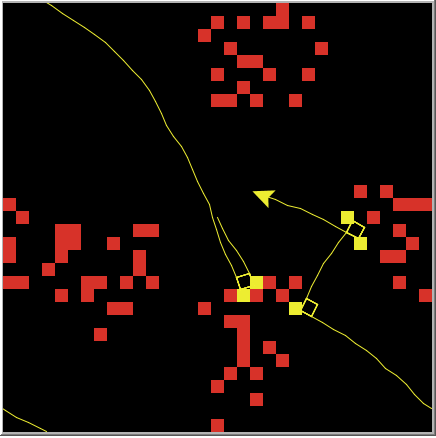- Será suficiente con representar al cazador de hongos de una manera muy simplificada: como un punto ( o una flecha) en movimiento que tiene un cierto radio de detección, registra un cuántos hongos ha encontrado y también tiene en cuenta cuánto tiempo ha pasado desde que encontró el último hongo ( para cambiar de tipo de búsqueda)