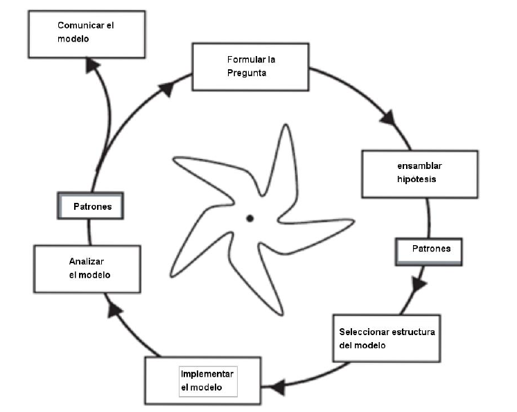 Cuando pensamos en un modelo como el de buscador de hongos (o el del albatros), intuitivamente realizamos una serie de tareas. El modelado científico significa realizar estas tareas de forma sistemática y utilizar los modelos basados en agentes, MOBAs, construidos (llamados con frecuencia simuladores) para validar rigurosamente las consecuencias de los supuestos simplificadores que componen nuestros modelos. Ser científico siempre significa repetir las tareas de modelado varias veces, porque nuestros primeros modelos siempre se pueden mejorar de alguna manera: son demasiado simples o demasiado complejos, o nos hicieron darnos cuenta de que estábamos haciendo las preguntas equivocadas. Por lo tanto, es útil ver el modelado como una iteración a través del llamado “ciclo de modelado” (figura 1.3).