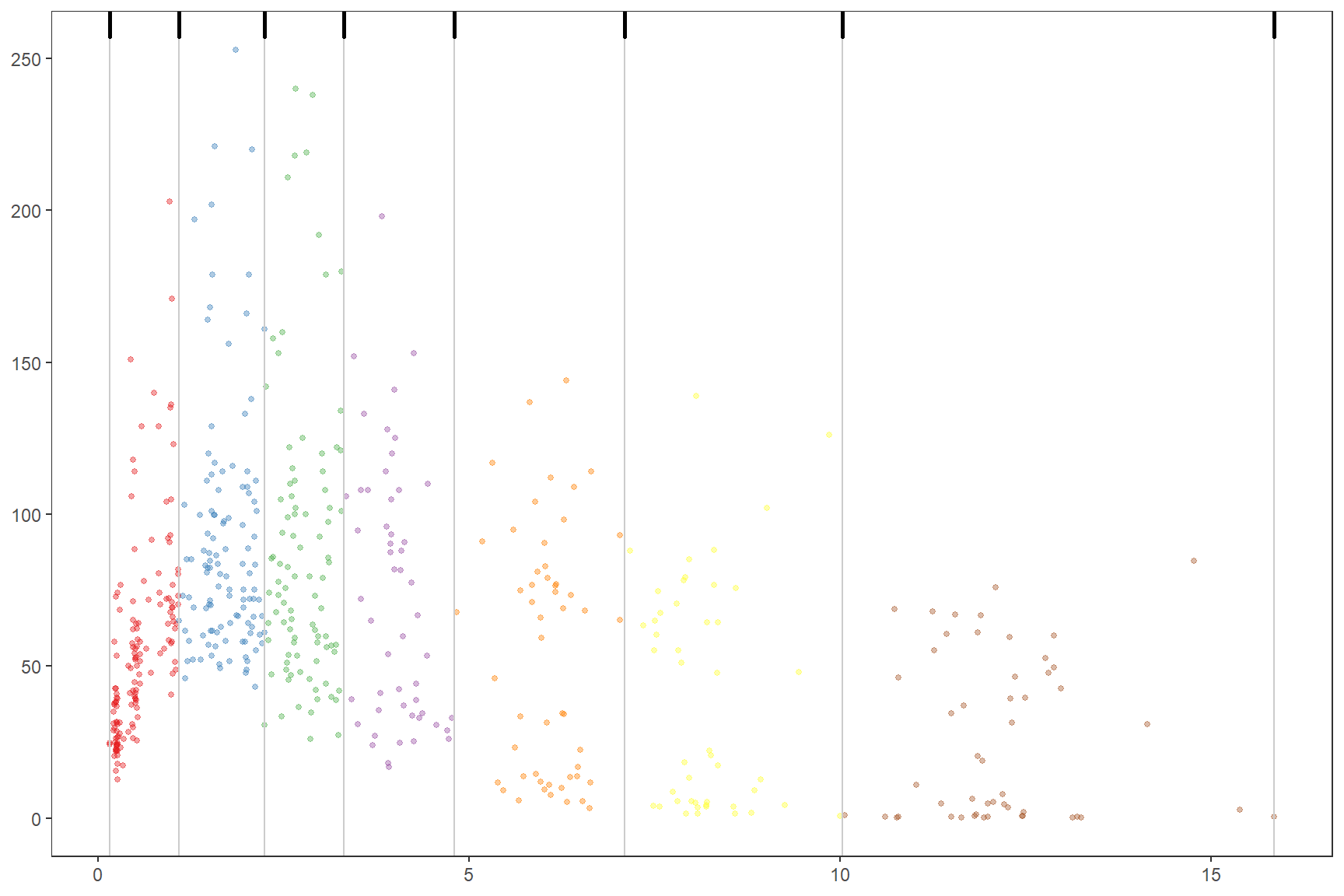 binning(stratum = list(GENDER = "F", STUDY = "Study A"), bin = "centers", centers = c(0.5,3,5,10,15), by.strata = T) %>%
