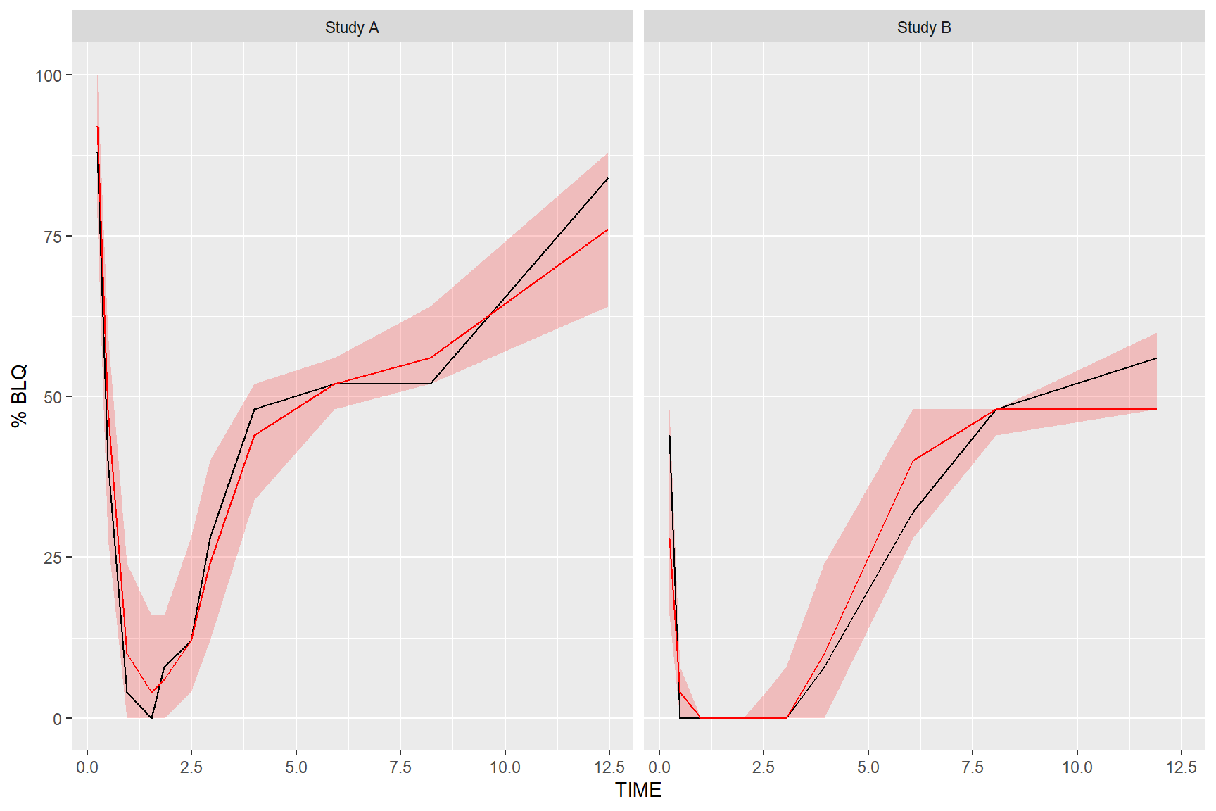 We can include geom_ribbon() using the lo and hi columns in the vpc$pctblq table to denote the lower/upper bounds of our confidence interval. Let’s also plot the median %blq of the simulated data using the md column in the vpc$pctblq table.