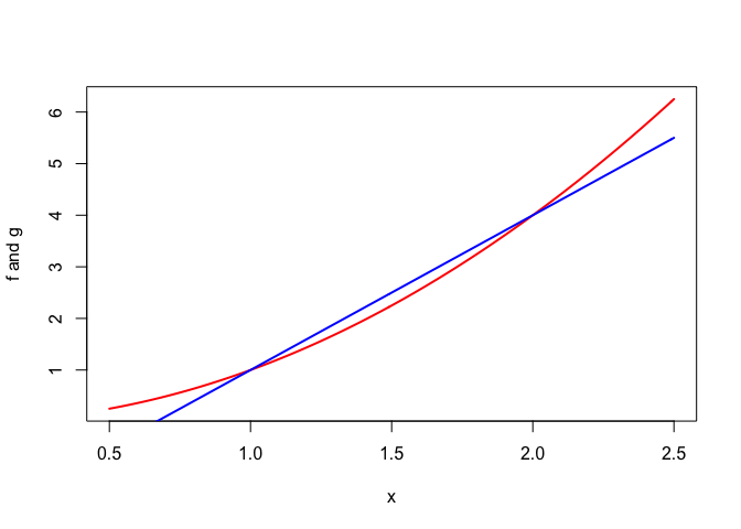 Function \(g\) is plotted in figure 7.1 in blue, function \(h\) is in red.