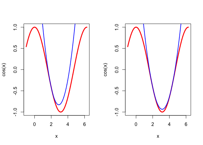 The function \(f:x\rightarrow\cos(x)\) provides a simple example of majorization, also used by Lange (2016 (in press)). We work out some additional details. Start with \[ \cos(x)=\cos(y)-\sin(y)(x-y)-\frac12 \cos(y)(x-y)^2+\frac16 \sin(y)(x-y)^3+\frac{1}{24}\cos(y)(x-y)^4+...\tag{1} \] Since \(f''(x)=\cos(x)\leq 1\) we see that \[ g(x,y):=\cos(y)-\sin(y)(x-y)+\frac12 (x-y)^2 \] provides a uniform quadratic majorizer. Thus the iteration map \[ A(x)=x+\sin(x) \] provides a uniform quadratic majorization algorithm.