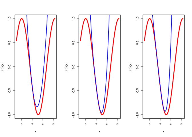 Now \[ \frac{A(x)-\pi}{x-\pi}=1-\frac{\sin(x-\pi)}{x-\pi}, \] and for \(0<x<2\pi\) we have \(0<1-\frac{\sin(x-\pi)}{x-\pi}<1,\) and thus the algorithm converges to \(\pi.\) As Lange (2016 (in press)) points out the algorithm has a cubic rate of convergence, because \[ A(\pi+x)-\pi=x+\sin(\pi+x)=\frac16 x^3+o(x^3), \] and thus \[ \lim_{x\rightarrow 0}\frac{A(\pi+x)-\pi}{x^3}=\frac16. \] As a consequence of cubic convergence, there is not much that can be done to improve the algorithm (which is of very limited practical usefulness anyway). Of course we could use the more precise majorizations \begin{align*} \cos(x)&\leq \cos(y)-\sin(y)(x-y)-\frac12 \cos(y) (x-y)^2+\frac16 |x-y|^3,\\ \cos(x)&\leq \cos(y)-\sin(y)(x-y)-\frac12 \cos(y)(x-y)^2+\frac16 \sin(y)(x-y)^3+\frac{1}{24}(x-y)^4, \end{align*}but they mostly increase the amount of computation in an iteration and do not improve much. The quadratic majorization at \(y=2\) has its minimum at 2.1974, the cubic majorization at 2.9952, and the quartic majorization at 2.9270. The three majorizations at \(y=2\) are shown in Figure 1.