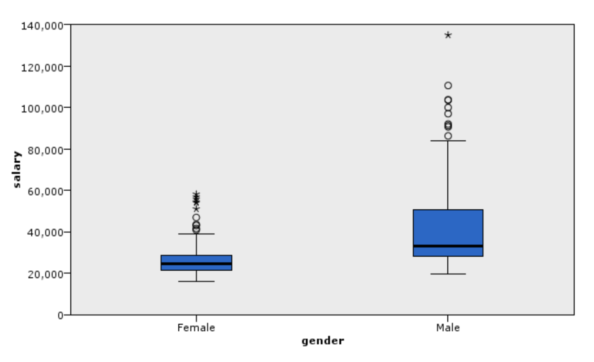 It becomes more interesting when we look not just at one metric variable, but how it relates to different groups, e.g. how age is distributed according to gender.