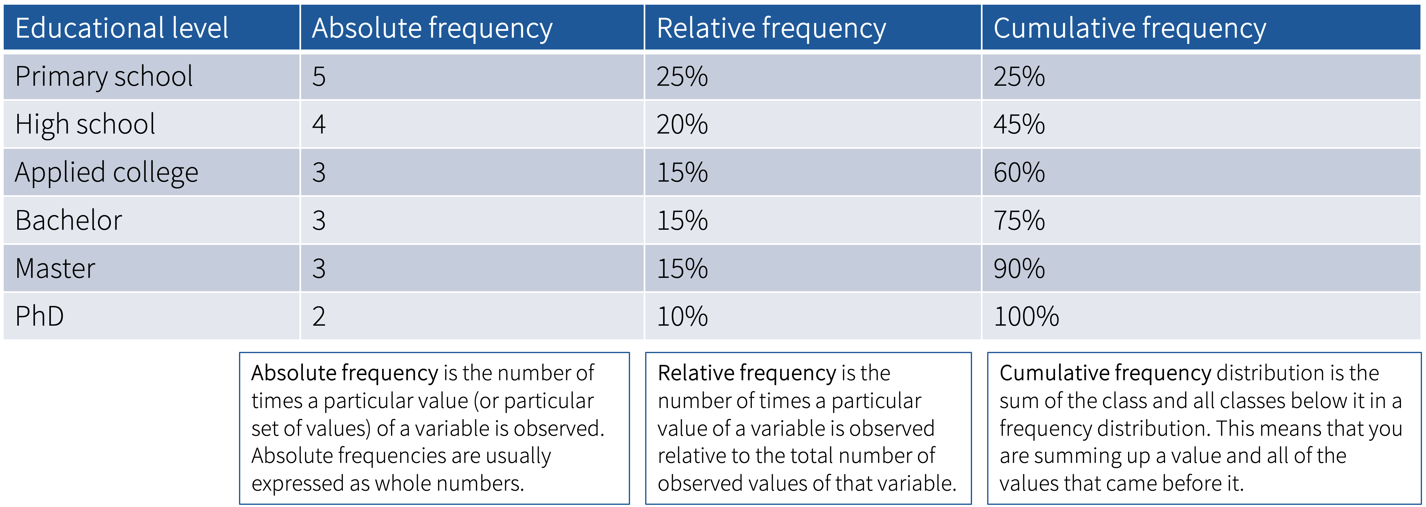 Relative frequency = how many times a value is observed relative to the total number of observed values (i.e., percentages of total)