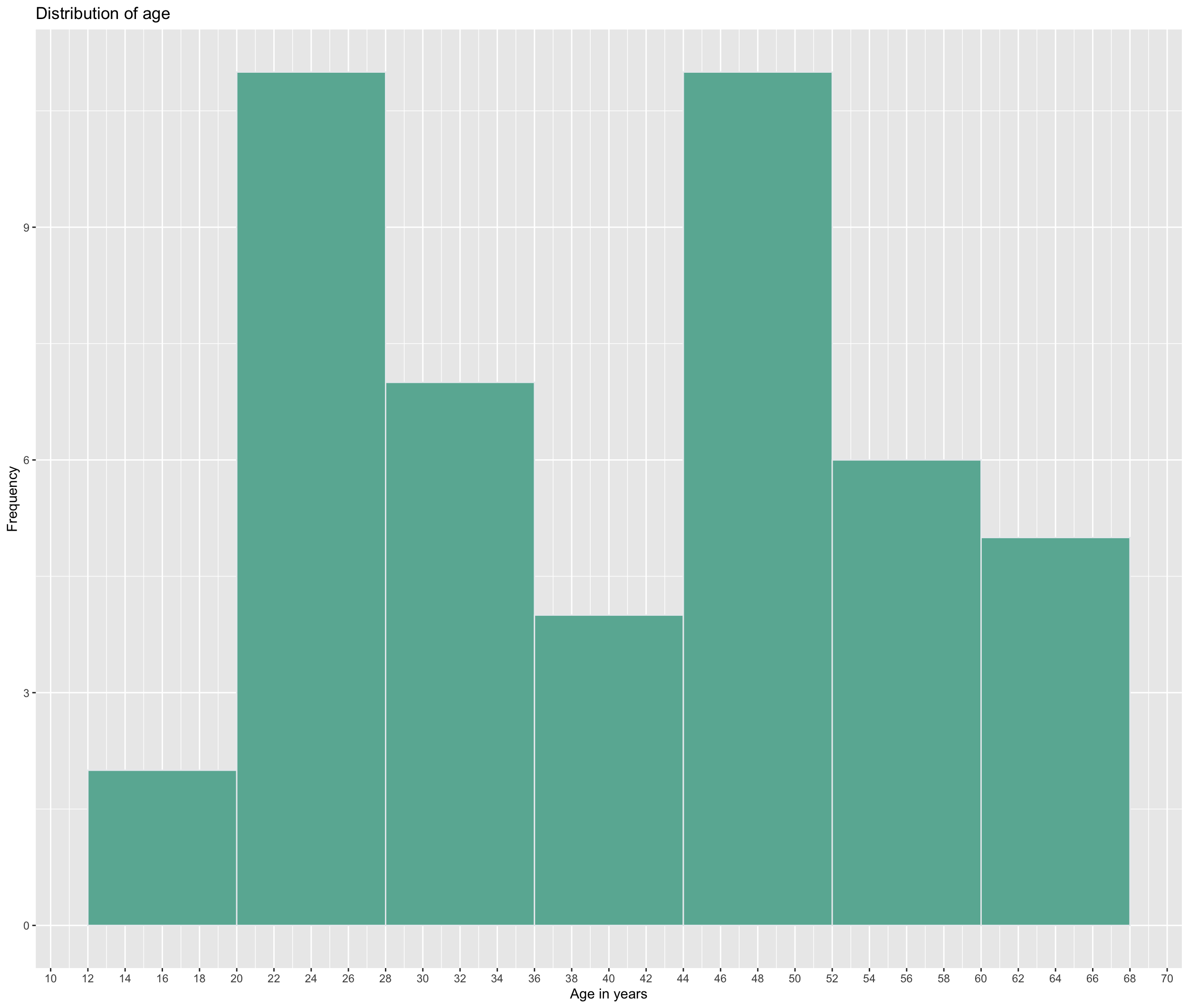 labs(title = "Distribution of age", x = "Age in years", y = "Frequency") +