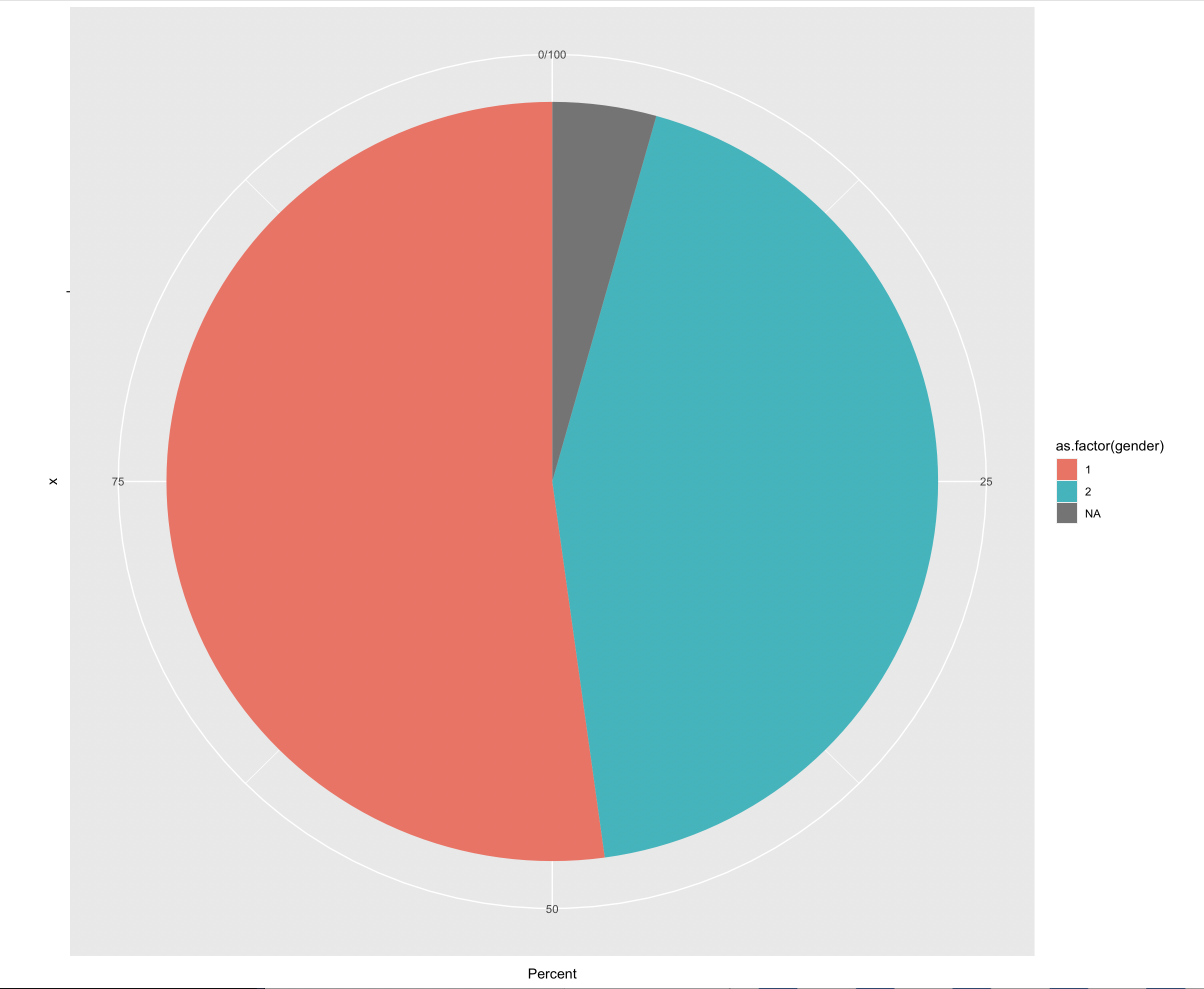 ggplot(gender_freq_perc, aes(x="", y=Percent, fill=as.factor(gender))) +