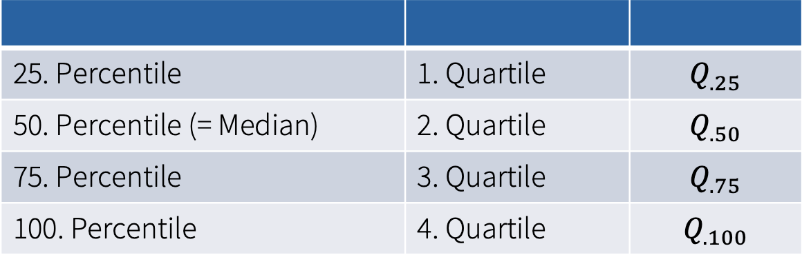 We calculate the interquartile range by: The formula for calculating the interquartile range of a set of values is given by: \[ IQR = Q._{\text{75}} - Q._{\text{25}} \] where \(Q._{\text{75}}\) is the value of the 3. quartile (75th percentile), and \(Q._{\text{25}}\) is the value of the 1. quartile (25th percentile).