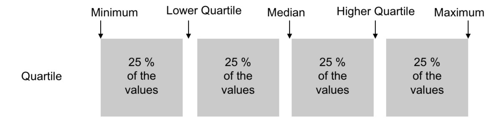 Interquartile range (IQR) is the range of the middle 50% of the values. It is relatively resistant to outliers. To calculate it, we use quartiles, which divide the data into four parts: