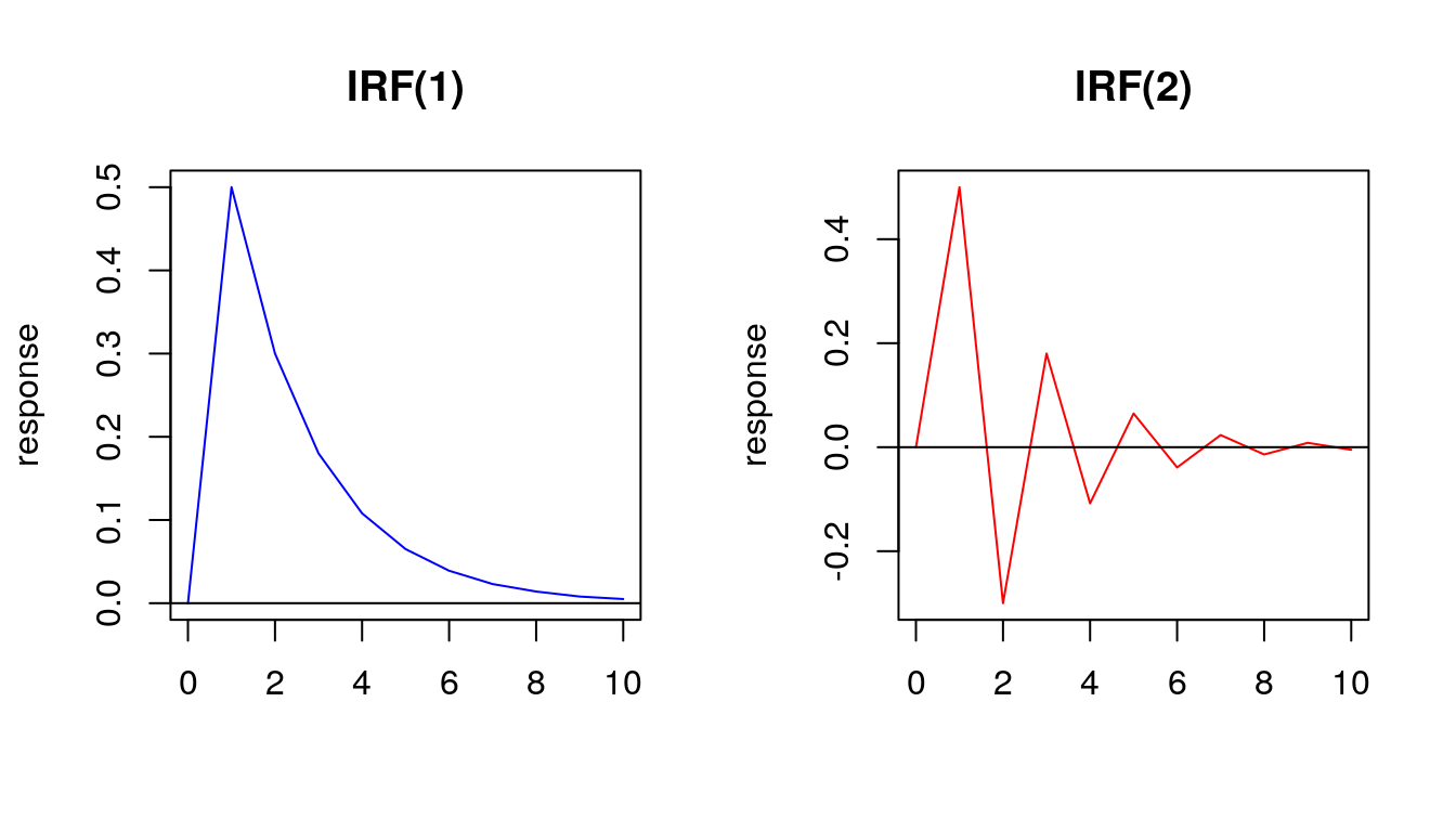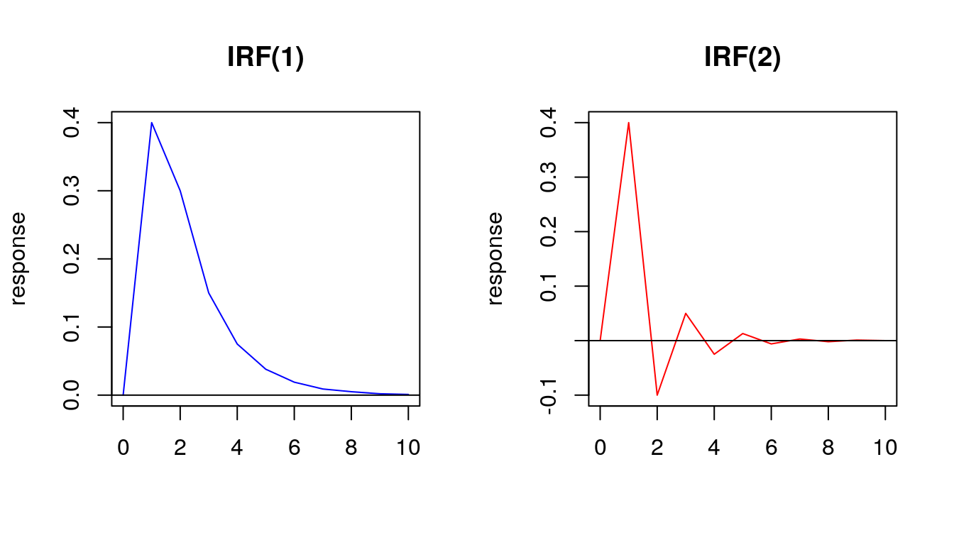 \[\begin{equation} IRF=\left\{\begin{array}{cl} 0 & for~t=0~(period~zero)\\ \beta_1 & for~t=1~(first~period)\\ (\beta_2+ \beta_1\beta_3)\beta_3^{t-1} & for~t=2,3,...,\infty~(all~future~periods)\end{array}\right. \tag{9.11} \end{equation}\]