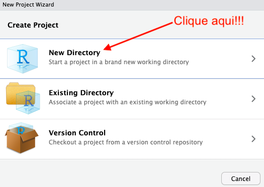 Vamos iniciar com a criaçào de um projeto chamado Analise1. Para tal, acesse o menu File \(\rightarrow\) New Project. Após isso, podemos escolher criar um novo diretório ou usar um diretório existente para hospedar nosso projeto. Vamos criar um novo diretório. Clique em New Directory.