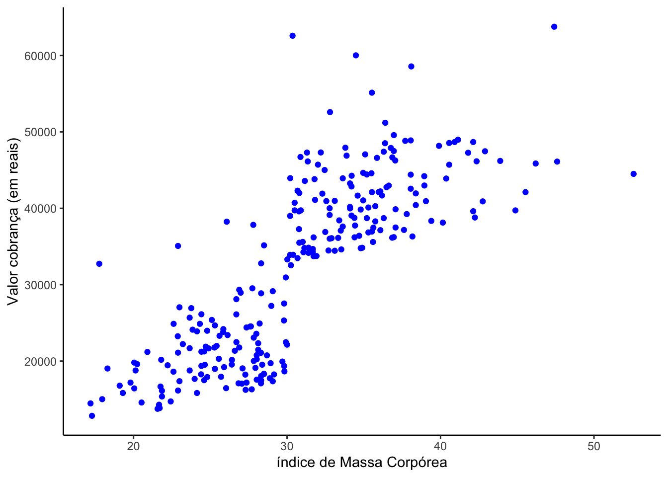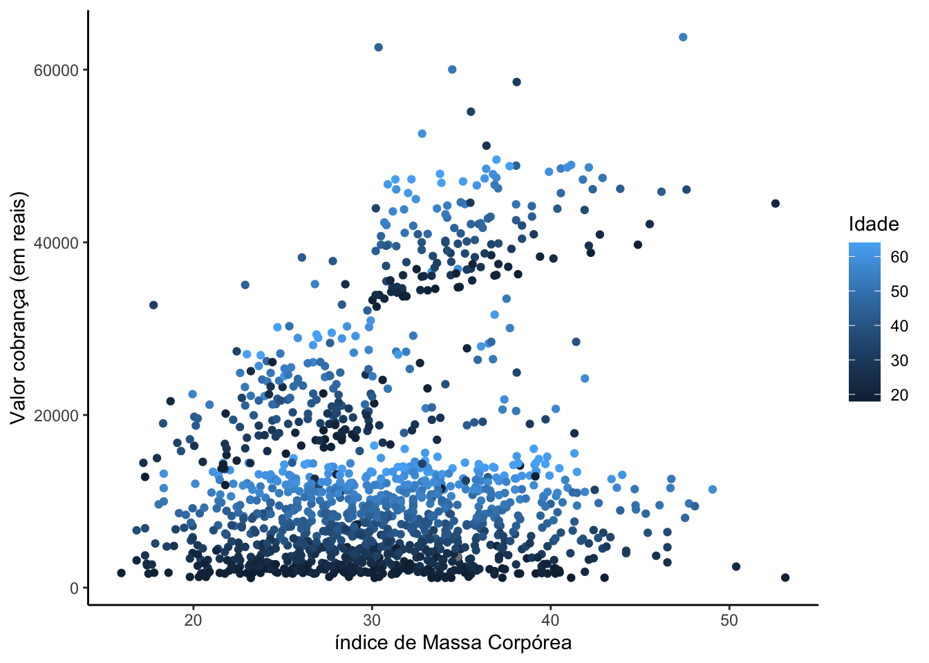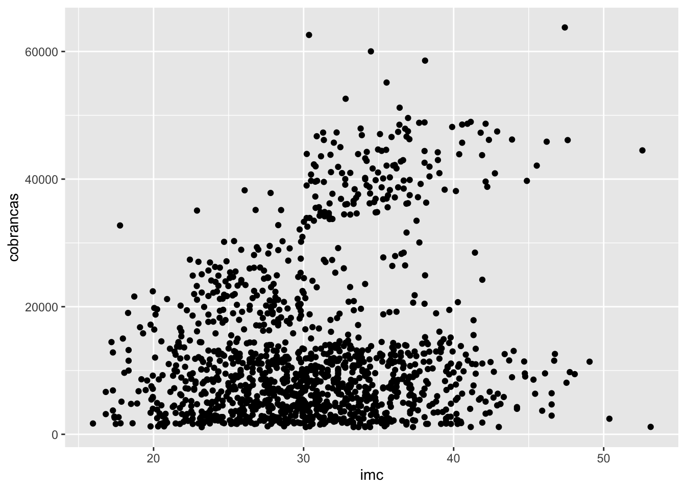 O gráfico resultante possui a variável imc no eixo x e cobranças no eixo y. O default do gráfico é possuir o fundo cinza e pontos da cor preta. Os rótulos dos eixos são preenchidos automaticamente com os nomes das variáveis. Entretanto, é possível alterarmos toda essa configuração básica, usando o argumento color