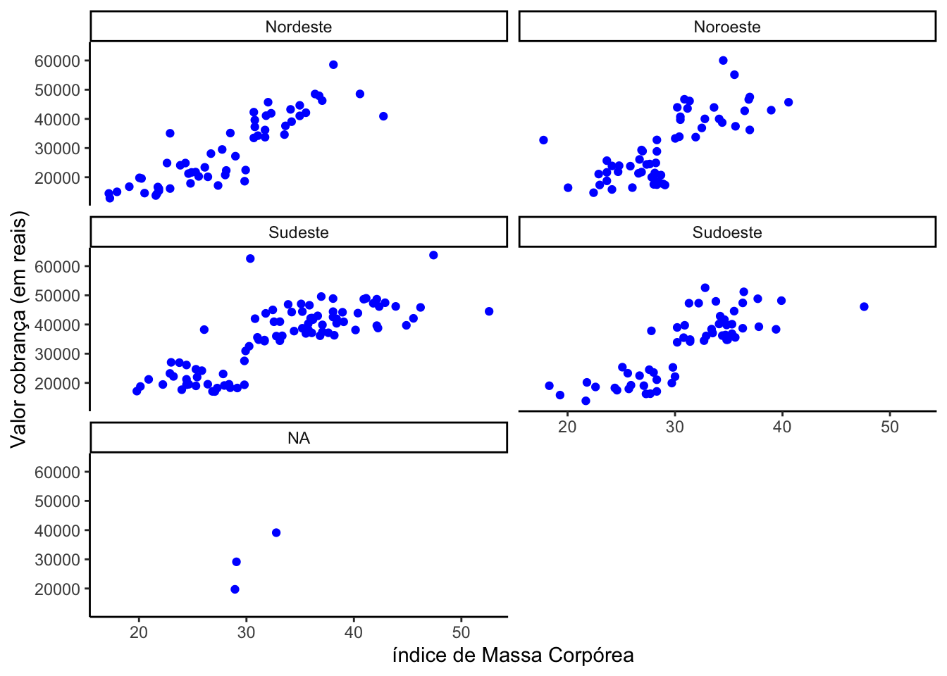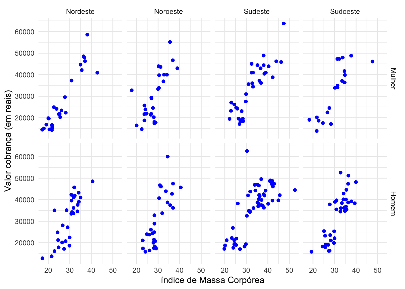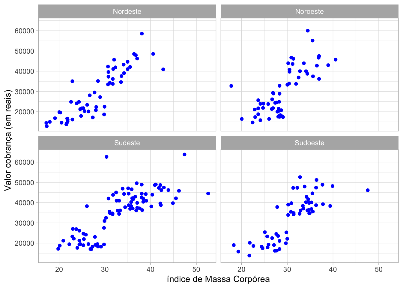 O gráfico resultante possui a variável imc no eixo x e cobranças no eixo y. O default do gráfico é possuir o fundo cinza e pontos da cor preta. Os rótulos dos eixos são preenchidos automaticamente com os nomes das variáveis. Entretanto, é possível alterarmos toda essa configuração básica, usando o argumento color