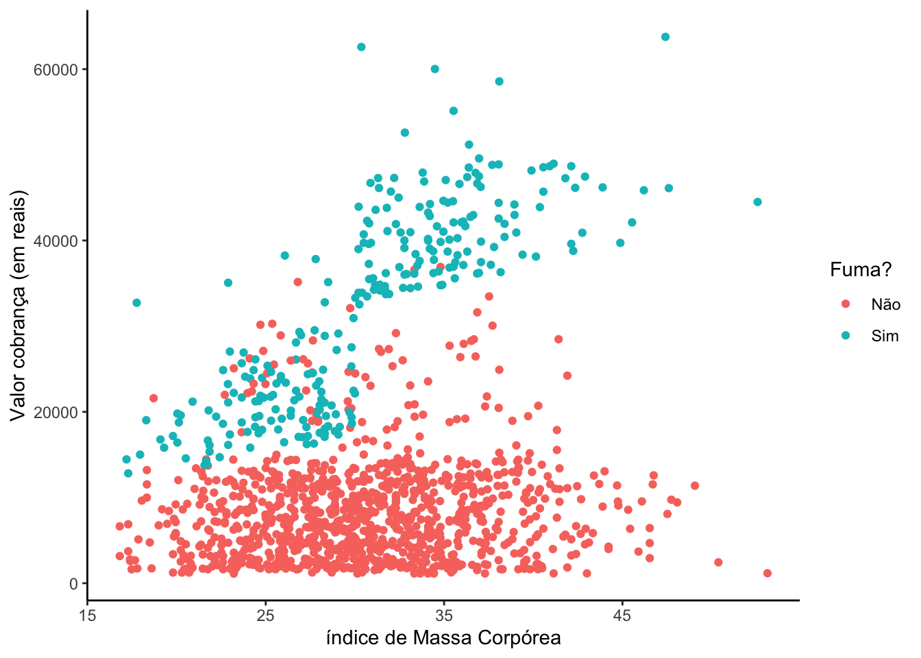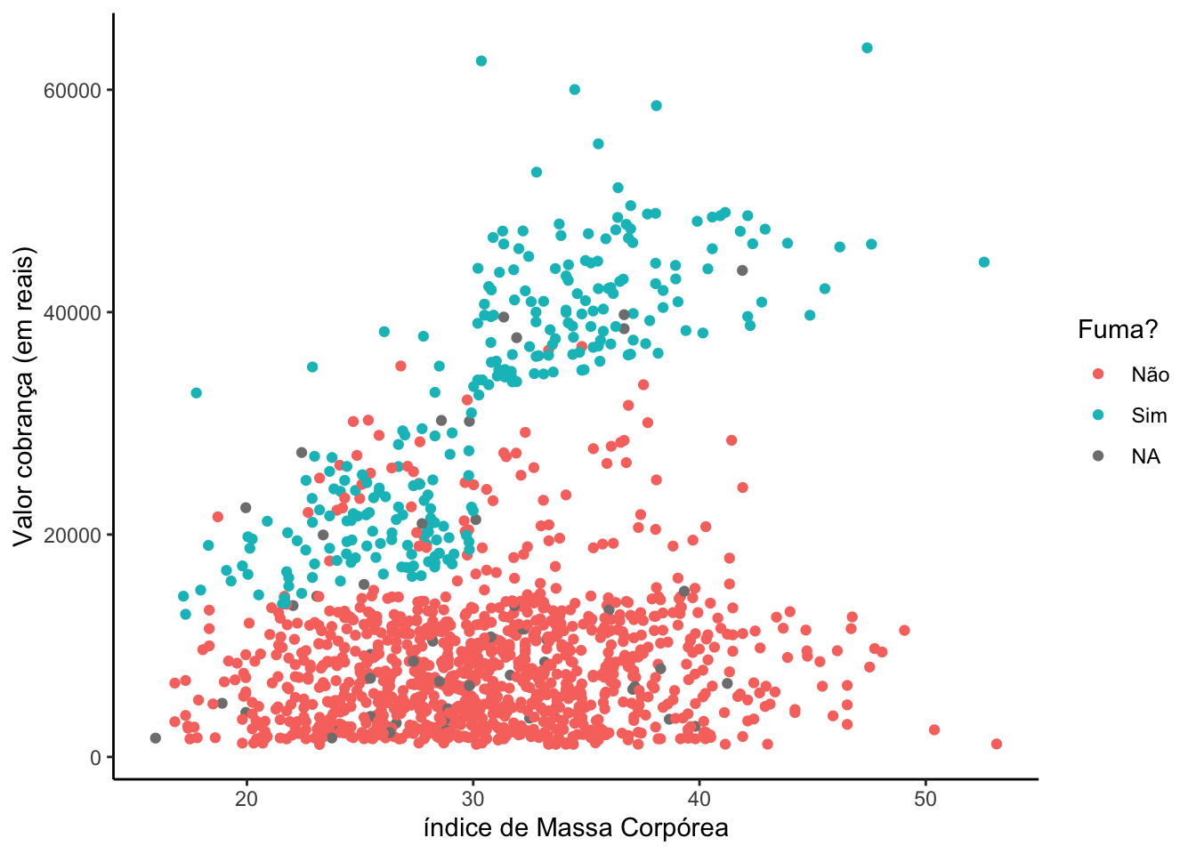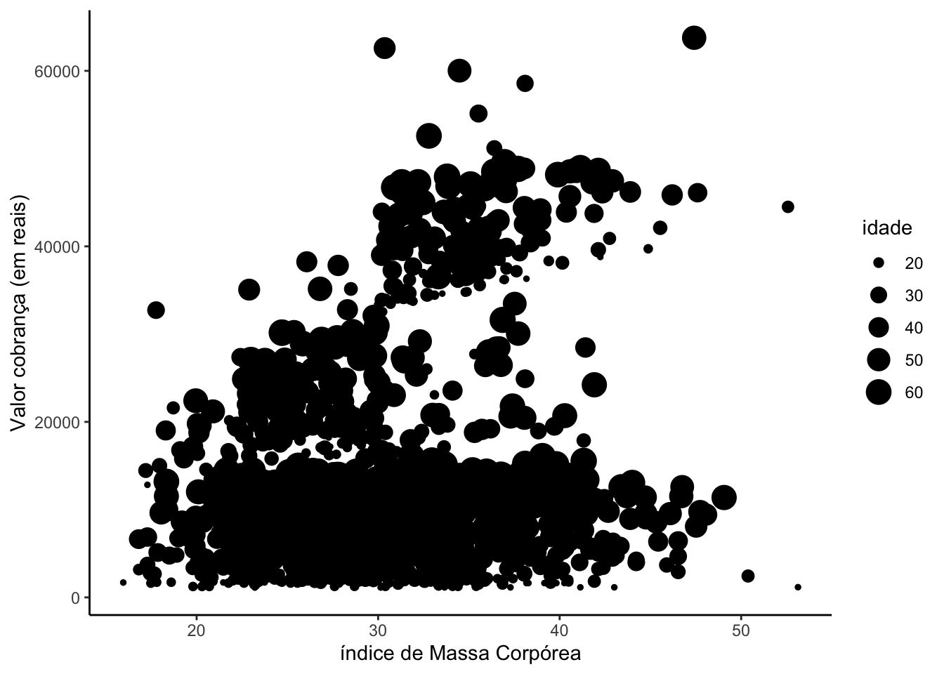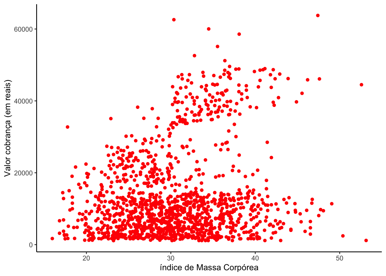 Vamos começar produzindo um gráfico de dispersão (também chamado de gráfico de pontos) das variáveis imc e valor da cobrança. Para elaborar este gráfico, iremos usar a função ggplot e geom_point (esta segunda é a responsável por fazer o gráfico de pontos, isto é, o gráfico é definido em função do geom_ que escolhemos).