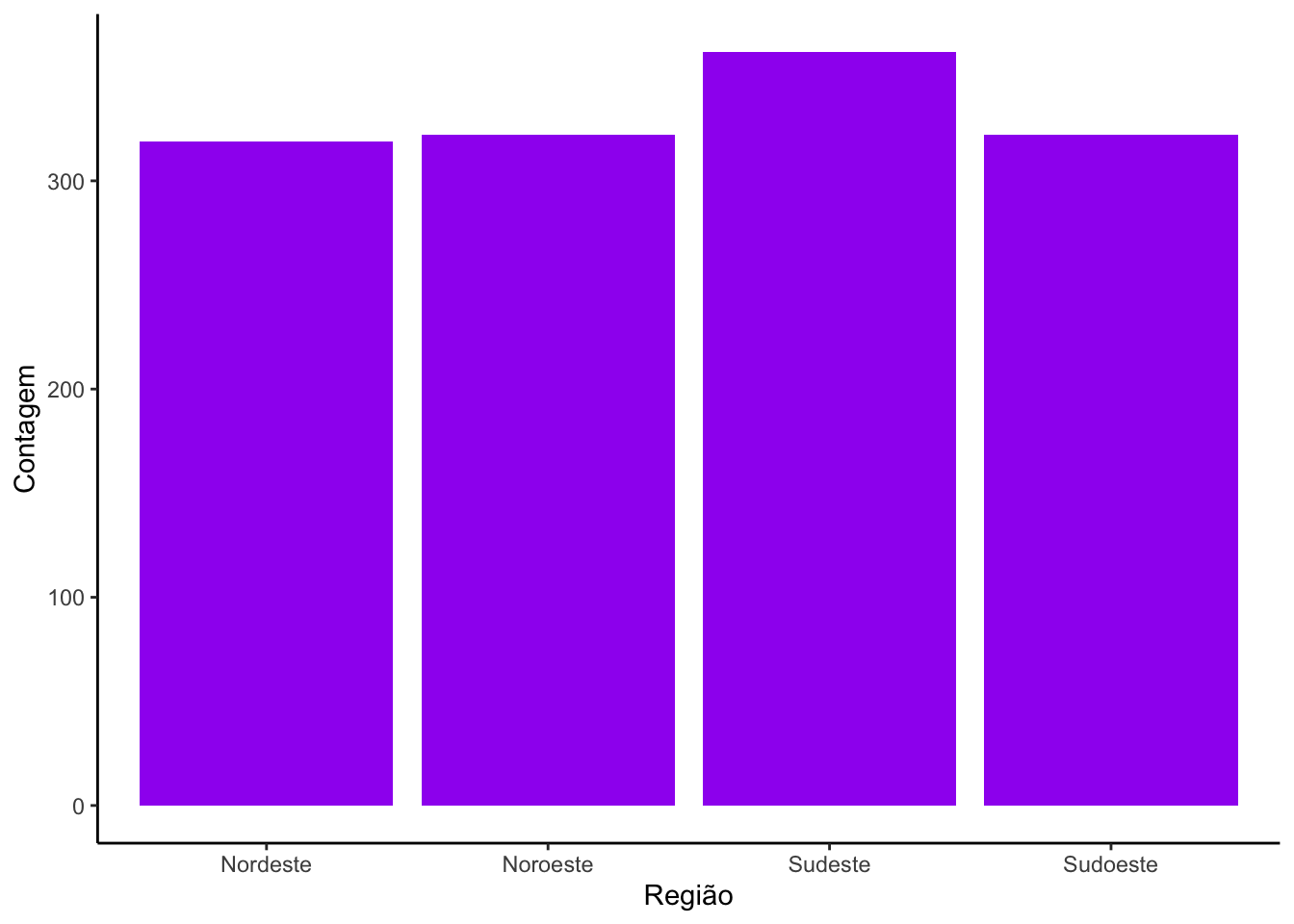 No gráfico acima indicamos no aesthetics (aes) qual variável seria apresentada no eixo x somente. Se especificarmos o fill com uma cor no geom_bar, modificamos a cor do gráfico de barra.