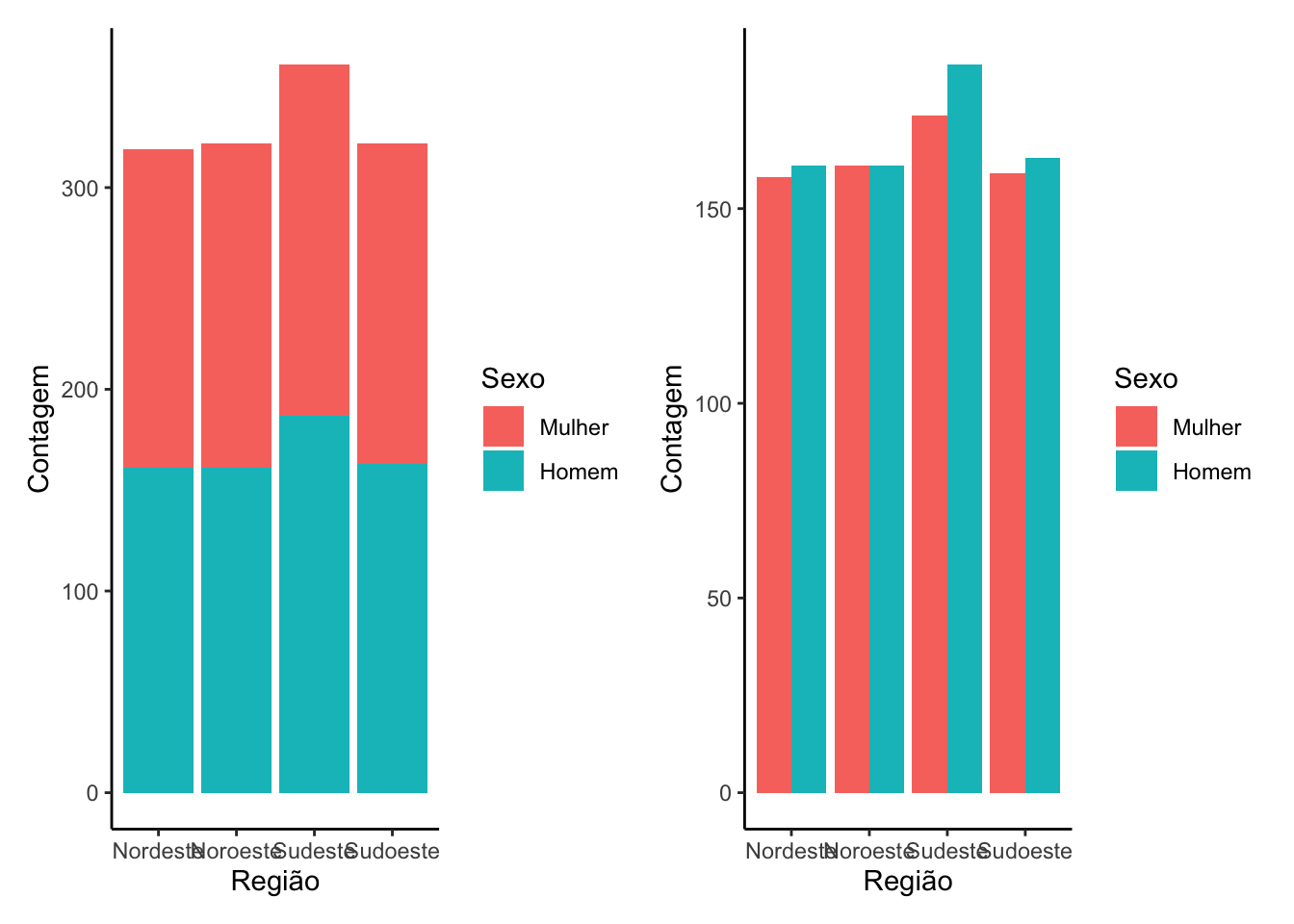 Se o nosso desejo for criar gráficos para tabelas de contingência, podemos fazer isso usando o geom_bar e fazendo uma pequena modificação no aes.