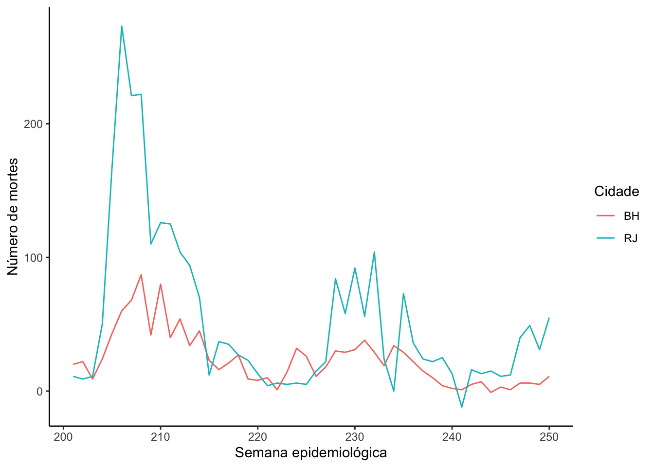 filter(city %in% c("Rio de Janeiro/RJ","Belo Horizonte/MG"), epi_week>=200, epi_week<=250) |> #filtrando dados da cidade do Rio de Janeiro, entre as semanas epidemiológicas 200 e 250