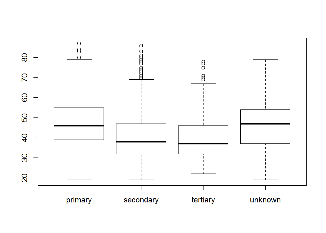 plot(x = banco$education, y = banco$age, main = "Edad por nivel educativo",