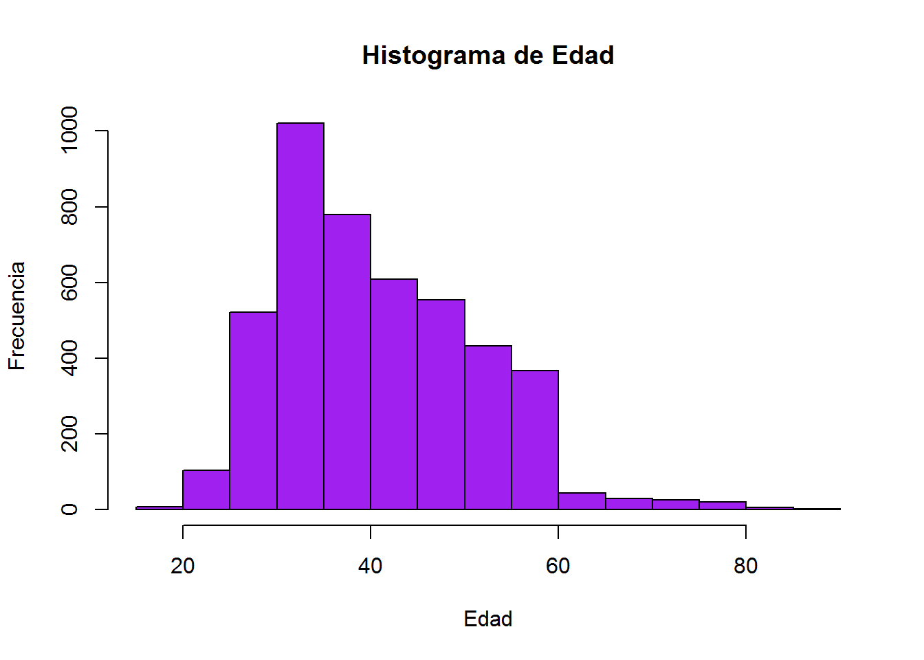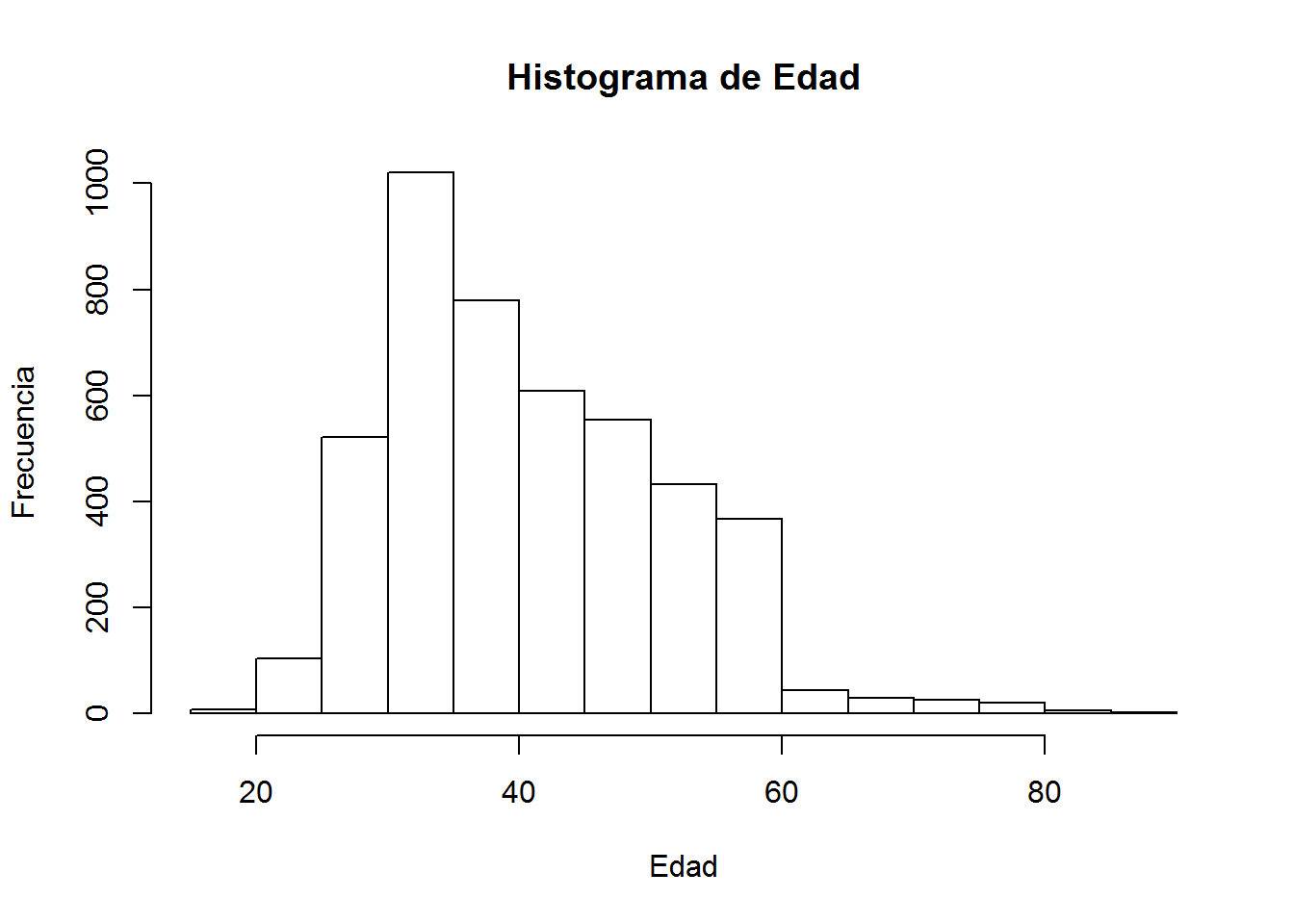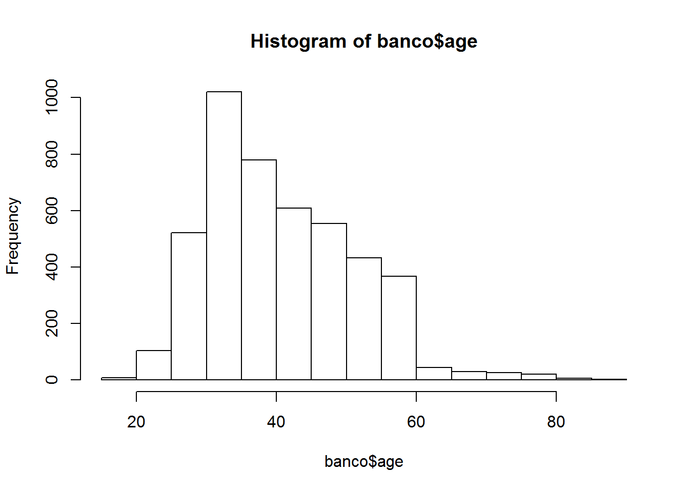 Daremos como argumento a hist() la columna age como un vector, extraido de banco usando el signo de dolar $, aunque también podemos usar corchetes e índices.