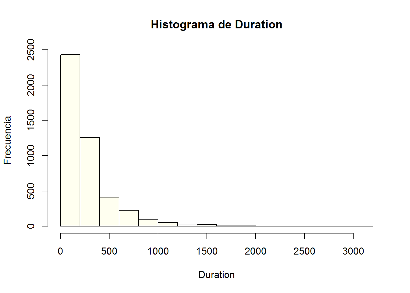 Creamos ahora un histograma con los mismos argumentos, pero con los datos de la columna “duration”, con barras de color marfil (“ivory”) y los títulos apropiados.