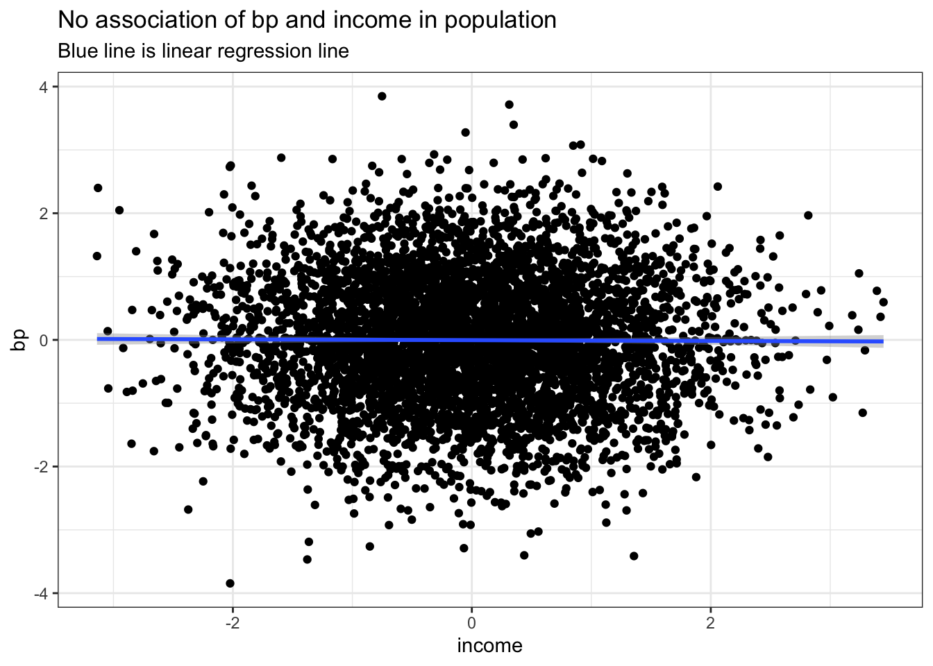 Next let’s simulate and plot some data. Notice income and BP are selected as random variables with no association between them as shown in the plot.