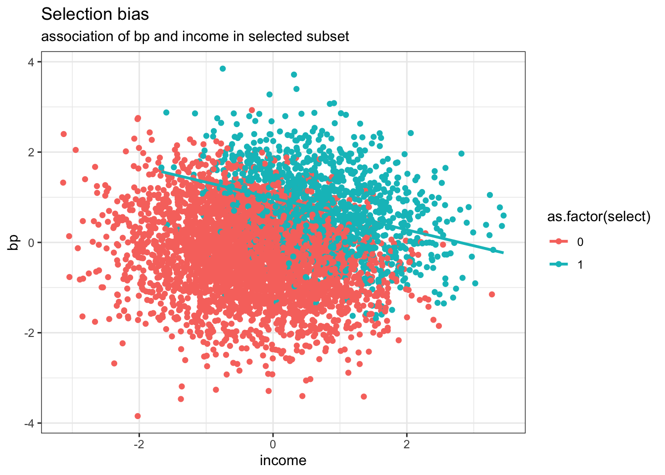 Let us consider a slightly more realistic example. Suppose both higher income (greater accessibiity) and blood pressure (greater medical need) lead to more doctor visits. Suppose further that there is no relationship between income and blood pressure. What happens if we analyze a subpopulation of those who visit the doctor?