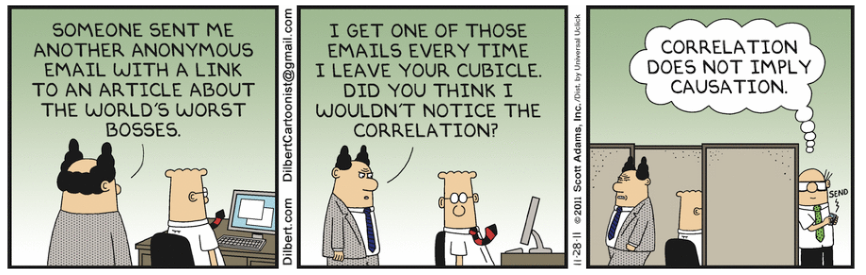 The ubiquitous aphorism “Association (correlation) does not imply causation” is well known and even appears in comic strips.