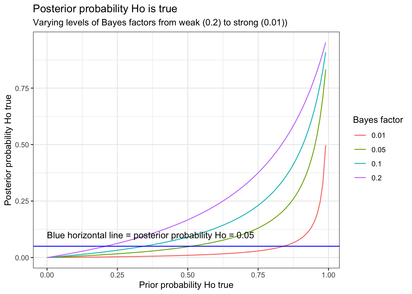 annotate("text", label ="Blue horizontal line = posterior probability Ho = 0.05", x=0, y=.1, hjust=0) +