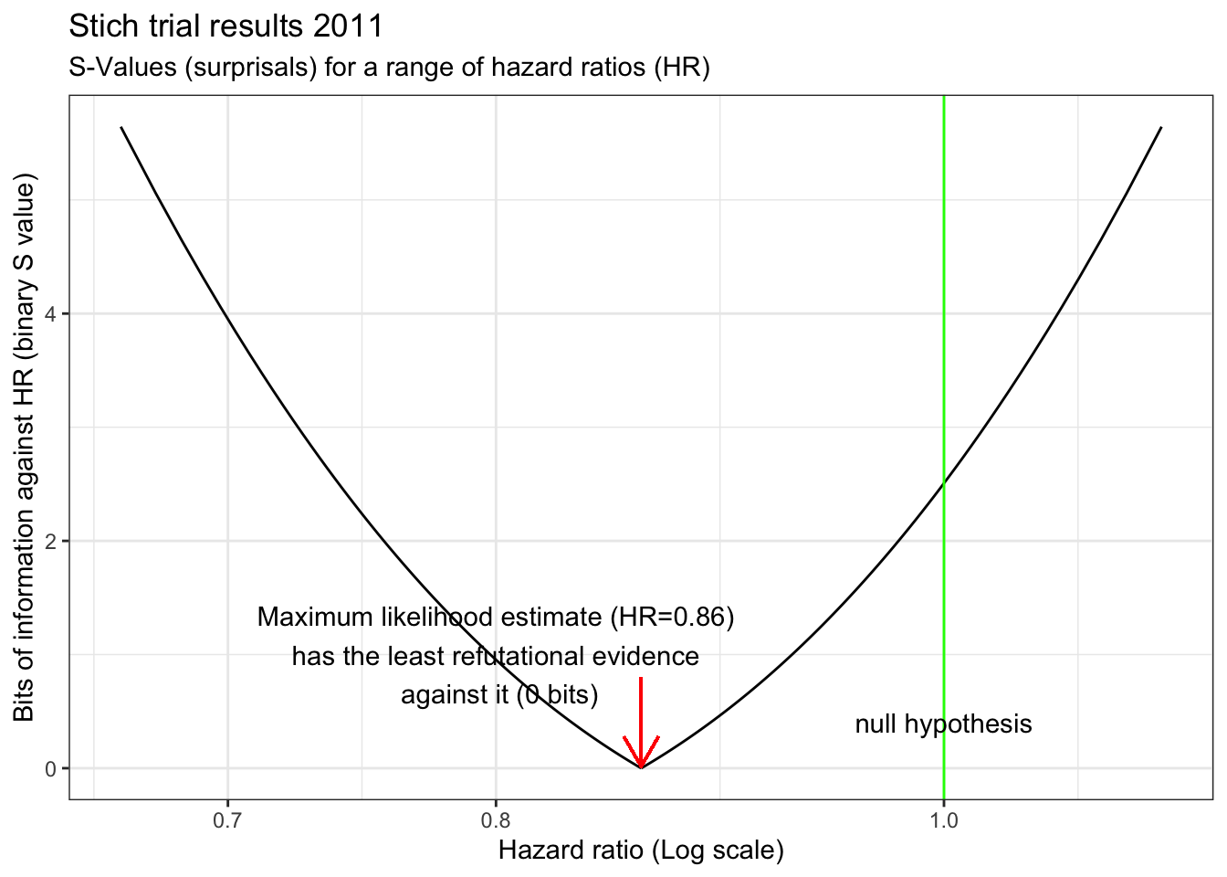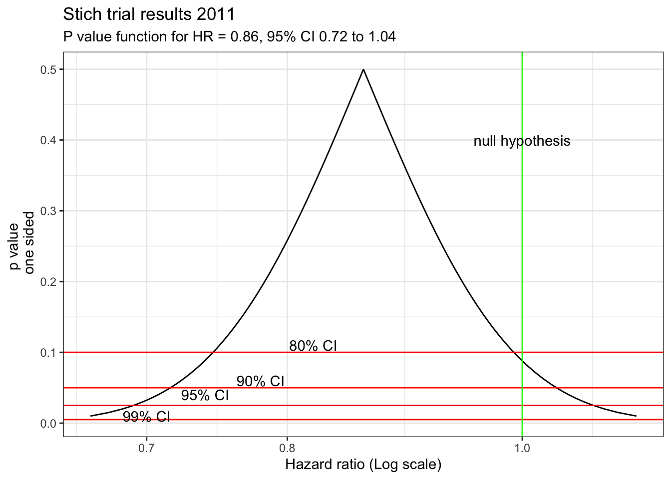 This figure shows that accepting an 83% CI provides a statistically significant interval since it excludes the null value of HR=1. Of course, this doesn’t supply conclusive evidence for the superiority of CABG but does show the presence of some weight in its favor in contrast to the typical interpretation of a dichotomized p value > 0.05. A more nuanced conclusion would be that due to the limited statistical power, definitive evidence for the superiority of either technique is not available. However the best estimate is a 14% reduction in mortality with CABG, with sampling variability such that the benefit may be as large 28% or even a 4% increased risk.