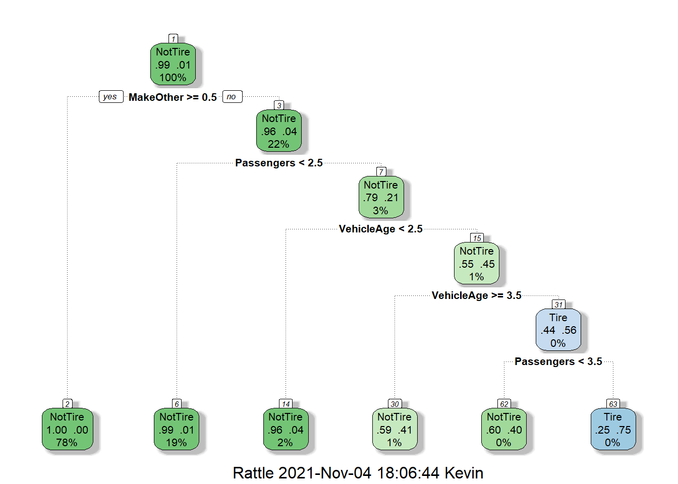 Below is a sample (classification) decision tree I generated using the train() function from the caret package. The data came from dataset ex2018 of the Sleuth3 package; ex2018 contains data on 1995 and later model compact sports utility vehicles that were involved in fatal accidents in the US between 1995 and 1999.