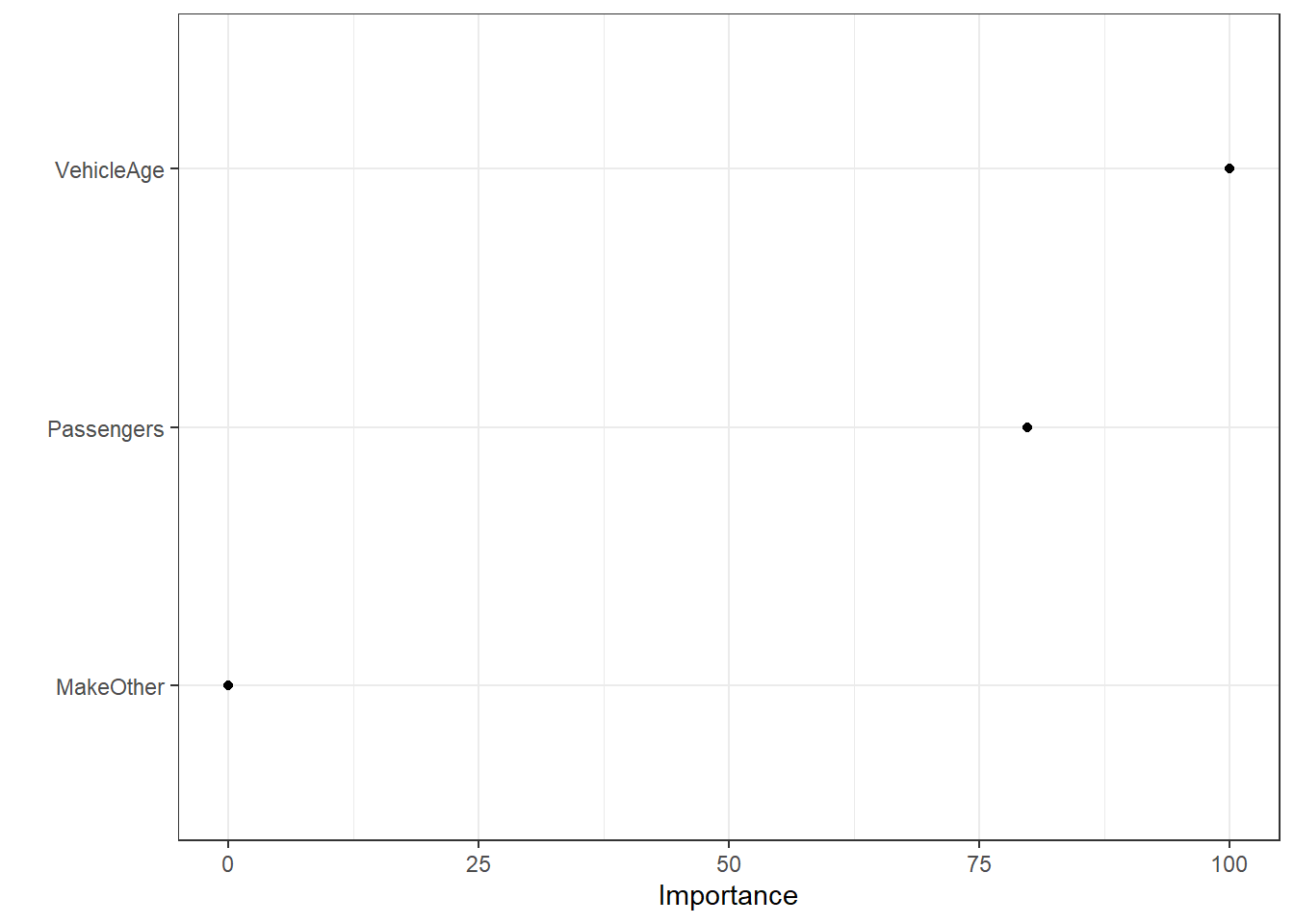 Using the ex2018 again, one can calculate a feature importance plot using the vip() function from the vip package as such (the more “useful” the variable, the higher its importance) - note that the variable importance of all decision trees trained using the caret package will be automatically scaled to out of 100: