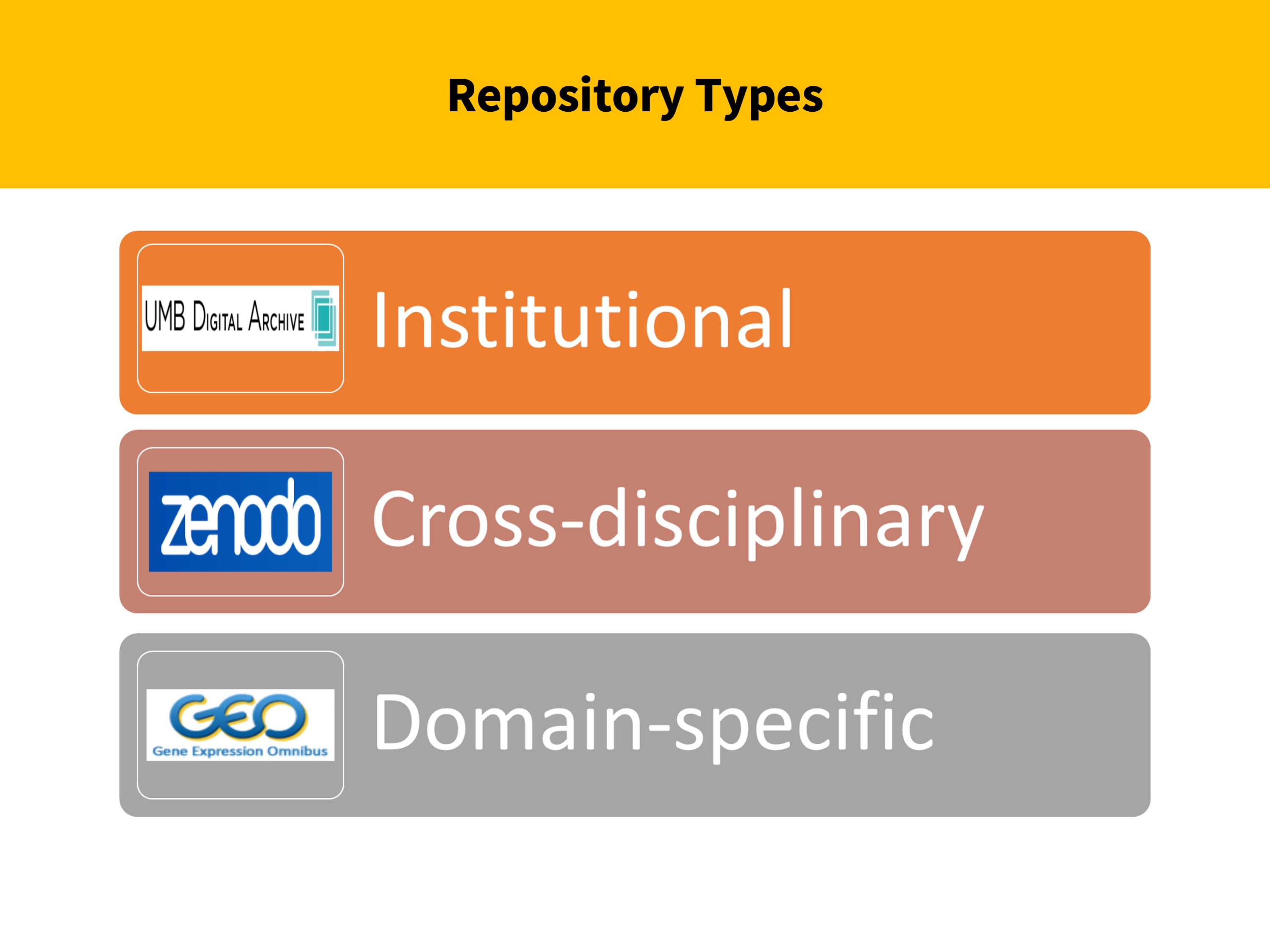 Domain-specific repositories hold data within a specific subject domain. An example of this is NCBI’s Gene Expression Omnibus. NIH maintains a list of 65 domain-specific repositories.
